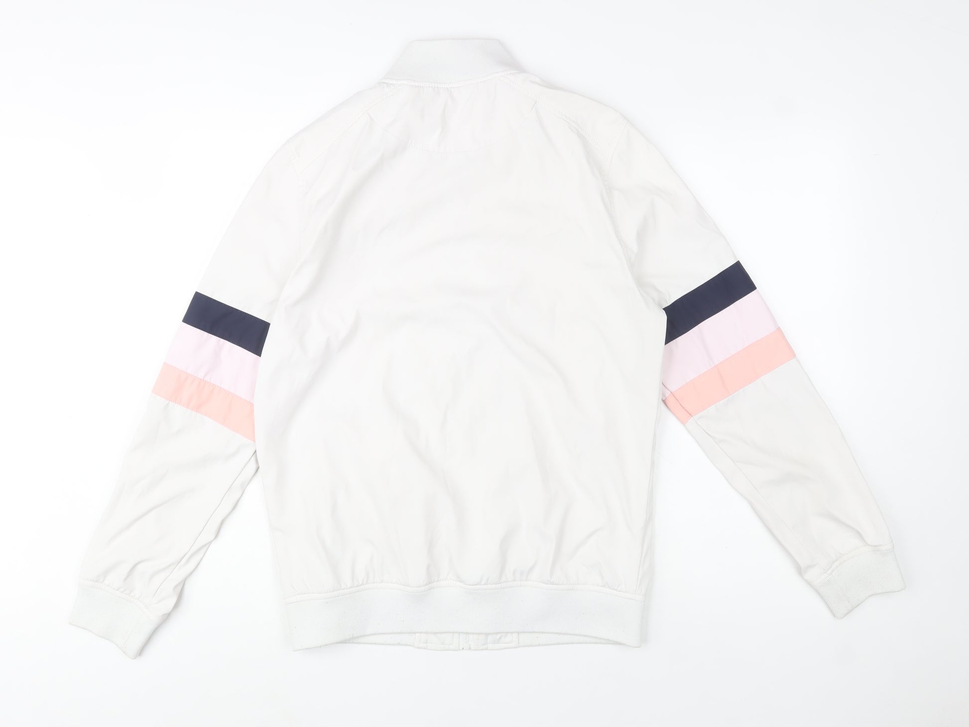 This Lyle & Scott men’s white bomber jacket is a perfect blend of sporty casual and timeless style. Designed in a crisp white tone, it features subtle block stripes on the sleeves in navy, light pink, and peach, giving it a modern edge while maintaining a clean, versatile appeal. Crafted from a softshell blend of 85% polyester and 15% cotton, the jacket ensures both comfort and durability, making it ideal for everyday wear during the milder seasons of spring and autumn. The piece includes a full front zip closure, two side pockets, and a ribbed collar, cuffs, and hem for a snug yet flexible fit. Finished with the iconic Lyle & Scott golden eagle logo on the chest, it subtly communicates quality and contemporary heritage. The smooth polyester lining adds comfort, while the lightweight build provides easy layering over casual shirts or tees. Whether paired with jeans, chinos, or joggers, this jacket transitions effortlessly from weekend outings to relaxed social settings. In excellent pre-owned condition, the fabric remains bright and fresh with minimal signs of wear, maintaining its premium look. Easy to care for and machine washable, this jacket is perfect for anyone looking for a stylish yet practical addition to their wardrobe. Lyle & Scott’s signature mix of tailored simplicity and sporty detailing makes this a standout choice for men seeking versatile outerwear that’s both classic and current. A fantastic piece for casual everyday wear, it offers a polished yet relaxed vibe—ideal for cooler days when you want comfort without compromising on style. A must-have essential for those who appreciate understated, high-quality menswear.