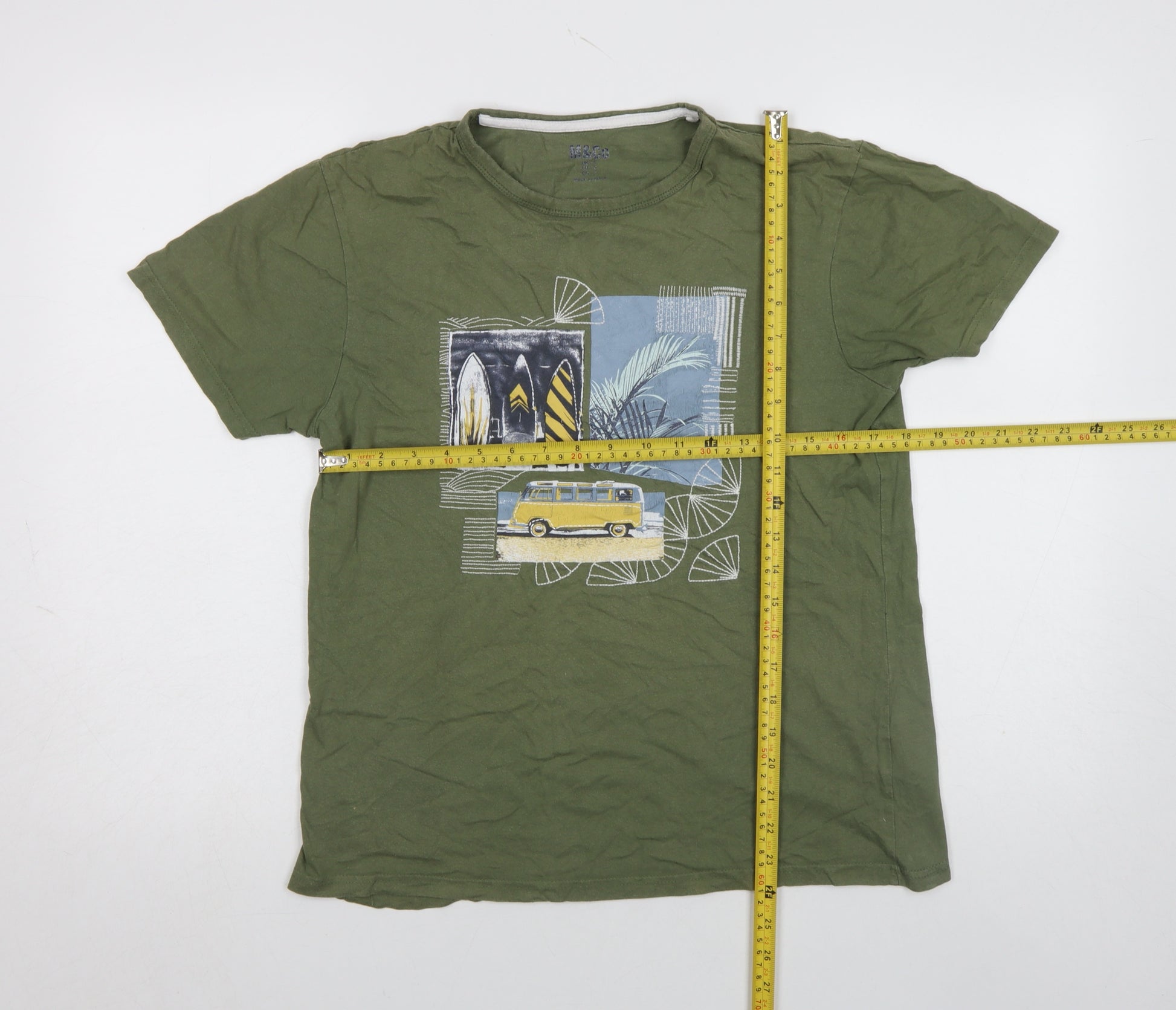 Add a touch of laid-back summer style to your wardrobe with this men’s green graphic T-shirt from M&Co. Designed for comfort, this classic short sleeve crew neck tee is crafted from 100% cotton, offering a soft and breathable feel that’s perfect for warmer weather. The lightweight jersey fabric ensures a relaxed fit, making it ideal for everyday wear, whether you’re spending a casual day outdoors, lounging at home, or heading out for a weekend break. The front design captures a retro surf vibe with a colourful beach-themed graphic featuring surfboards, palm leaves, and a classic camper van, making this tee a great choice for those who love coastal adventures and vintage-inspired style. Its versatile green shade pairs easily with jeans, shorts, or chinos for effortless outfit combinations. Machine washable for easy care, this M&Co T-shirt is built for all seasons and retains comfort with each wear. The fabric remains smooth and breathable, ensuring you stay cool and stylish throughout the day. In very good preloved condition, it shows only minor signs of previous wear, mainly slight creasing, and has plenty of life left. Perfect for adding casual charm to your look, this tee embodies the easy-going spirit of beach life combined with everyday practicality. A must-have staple piece for any men’s summer or spring wardrobe, offering quality, comfort, and effortless style from a trusted high street brand known for durable everyday essentials. With its graphic print and classic cut, it’s a timeless casualwear option ready to bring a cheerful, summery vibe to your outfit collection without compromising practicality or appeal.