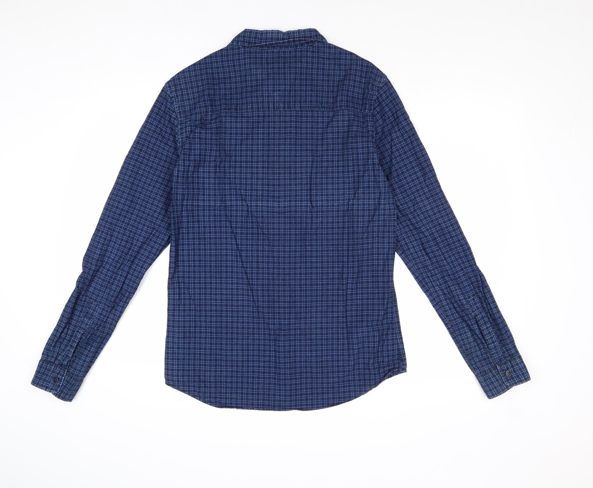 Mens Blue Check Cotton Button-Up Size S Collared Button