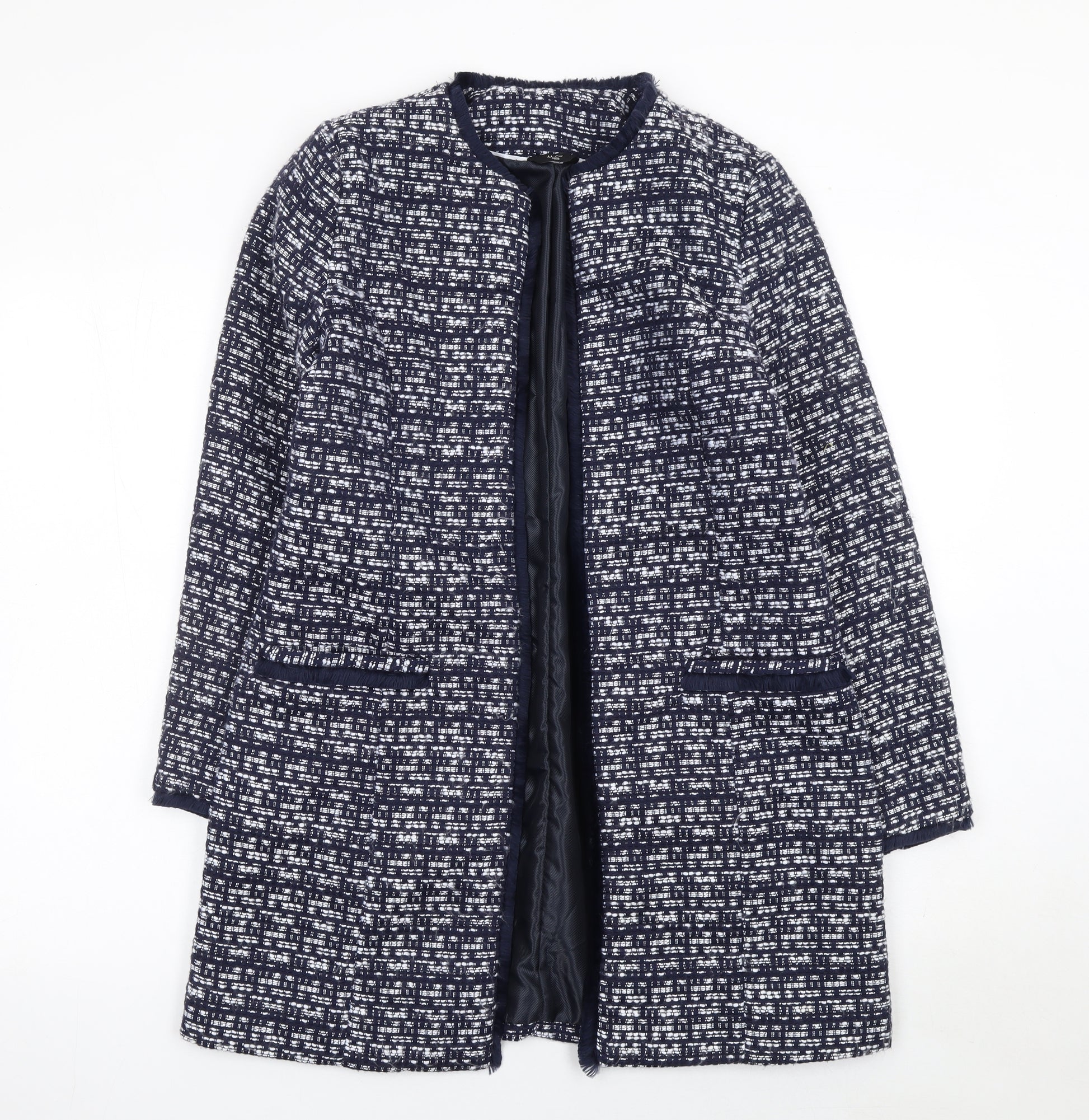 Add timeless elegance to your outerwear collection with this classic navy blue tweed coat from M&Co, perfectly tailored for women seeking both style and comfort. Designed in a flattering mid-length cut, this coat offers a versatile fit that pairs beautifully with both professional and casual outfits. Crafted from 100% polyester with a smooth polyester lining, it provides a soft yet structured silhouette that maintains its shape and texture. The open front design with subtle fringe detailing around the edges creates a minimalist yet refined aesthetic, ideal for layering over blouses, knitwear or dresses during cooler months.The attractive woven check pattern in shades of navy and white delivers a sophisticated finish, making it suitable for business, casual or smart occasions. Functional side pockets add practicality while keeping the design streamlined and chic. Perfect for autumn, spring and mild winter days, the lightweight yet lined construction ensures comfort and warmth without being too heavy. Its regular fit and long sleeves enhance practicality, making it a staple piece for various settings.This M&Co women’s coat embodies classic British style with a modern twist. With its relaxed open front and premium-quality tweed texture, it offers effortless style and dependable wear. The piece is in excellent pre-owned condition, showing very light signs of wear with no visible flaws. Whether worn to work, on a weekend outing or for a stylish evening layer, this coat is sure to become a go-to in your wardrobe.Pair it with tailored trousers for a polished office look or with jeans and boots for a casual yet refined ensemble. Durable and easy-care thanks to its machine-washable polyester fabric, this coat is both fashionable and functional — a must-have addition for any woman looking to elevate her wardrobe with sophistication and comfort.