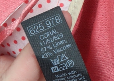 Step into effortless summer style with these beautiful M&Co women’s chino trousers in a refreshing pink shade. Crafted from a lightweight and breathable blend of 57% linen and 43% viscose, these trousers are perfect for warm weather wear, offering both comfort and sophistication. The classic chino design features front pleats that add a flattering drape, while the straight leg cut ensures a timeless silhouette suitable for casual outings or relaxed days at the office. The trousers come complete with practical side pockets and a single buttoned back pocket, ideal for small essentials. A zip fastening and waistband with belt loops provide a secure and adjustable fit. These trousers fall at a mid-rise, complementing most body shapes while showcasing everyday elegance. Their unpatterned, soft pink hue makes them easy to coordinate with a range of tops, from crisp white shirts to flowing blouses, creating a versatile foundation for your wardrobe. Ideal for spring and summer, this pair will keep you cool and polished from day to evening. Although gently pre-loved with a light mark near the pocket, the overall condition remains very good, reflecting minimal use and continued quality. Whether paired with sandals for a relaxed daytime look or dressed up with heels for a smart casual ensemble, these M&Co trousers deliver a balanced blend of style, comfort, and value. A must-have staple for anyone seeking breathable fabrics and classic design, perfect for seasonal wear and travel-ready style.