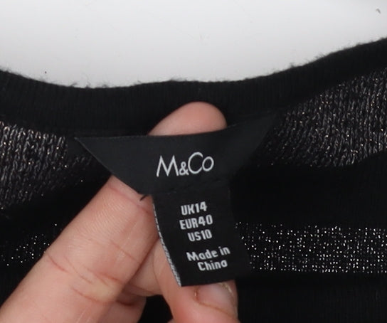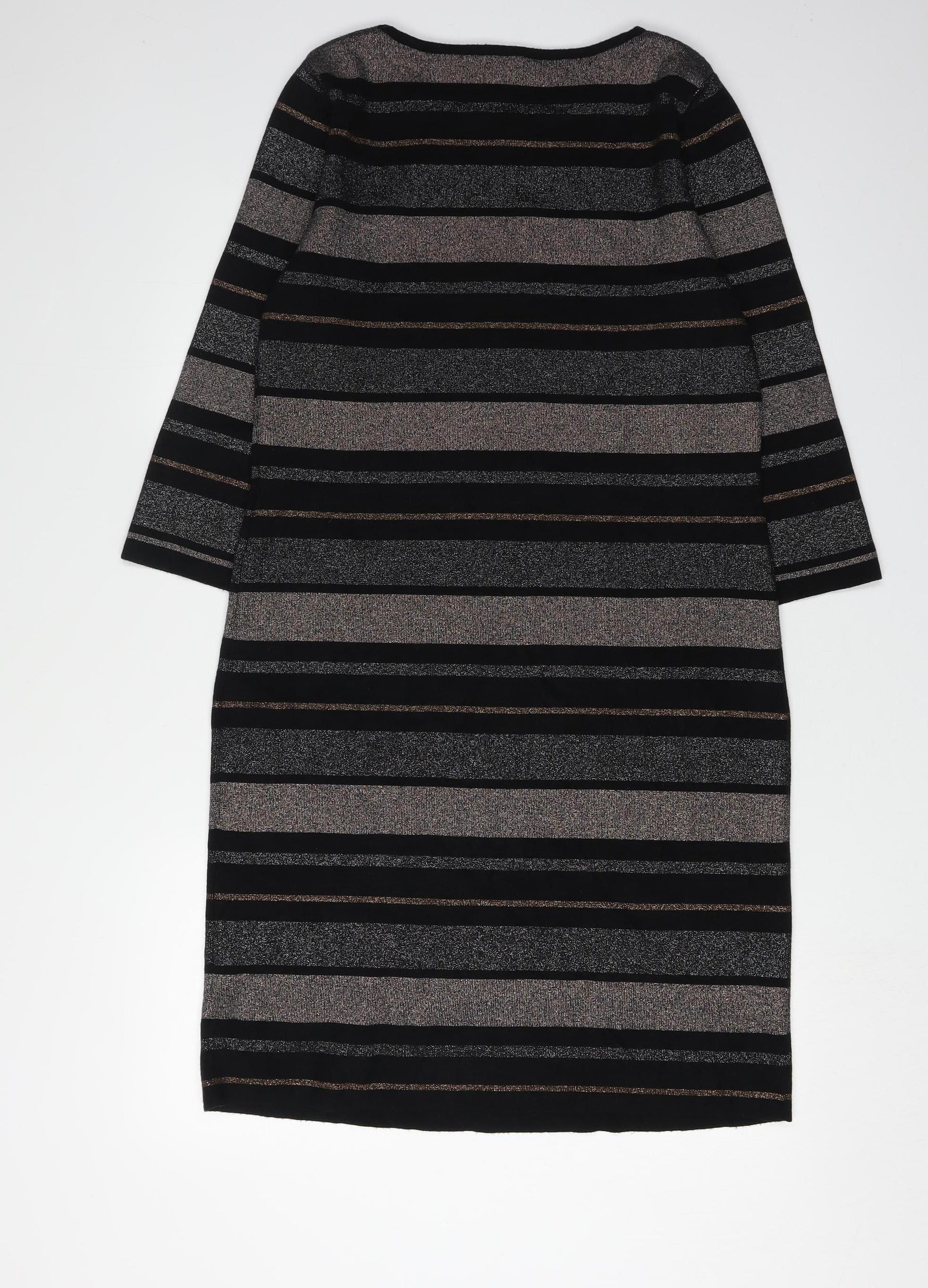 Embrace a sleek and versatile look with this M&Co Women's Black Striped Sheath Dress, perfect for casual outings or semi-formal occasions. Crafted from a luxurious blend of viscose, polyester, and nylon, this dress offers a comfortable and stylish fit that gently skims the body's natural curves. With a knee-length cut and eye-catching striped pattern, it adds a touch of contemporary charm to your wardrobe. The 3/4 sleeves and a classic boat neckline enhance its sophisticated appeal, making it ideal for cooler autumn and winter days. Whether you're heading to a casual meet-up or a day at work, this dress promises effortless elegance. Pair it with your favourite heels or boots for a complete, polished look. Condition is excellent with no visible damage, ensuring a high-quality addition to your fashion collection. Grab this versatile piece at an affordable price today and enjoy style that transcends seasons.