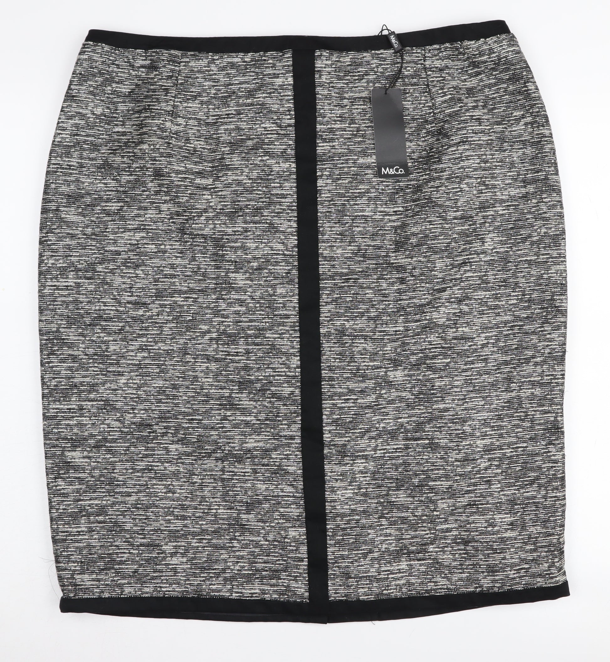 Elevate your wardrobe with this elegant grey pencil skirt from M&Co. Perfectly blending style and comfort, this skirt is crafted from a high-quality fabric mix of polyester, cotton, and elastane, ensuring a comfortable fit and durable wear. The sleek design features a versatile no-pattern look, ideal for pairing with your favourite tops and blouses. With a size 18 fit, this skirt ensures you're dressed to impress for any occasion, from business meetings to casual outings. Easy to care for with its machine washable fabric, it's a practical addition to your attire. Make a fashionable statement while staying true to your comfort with this must-have piece.