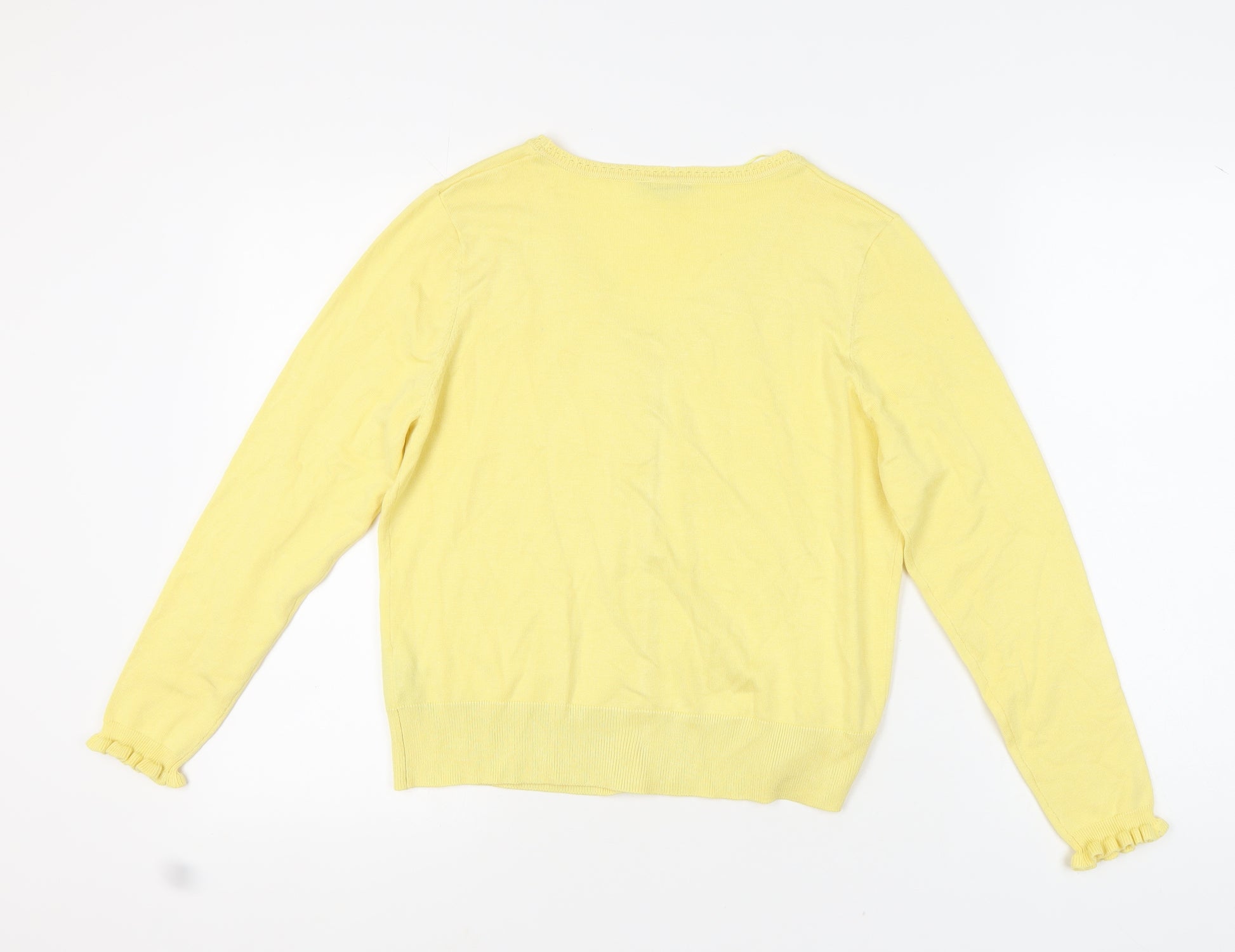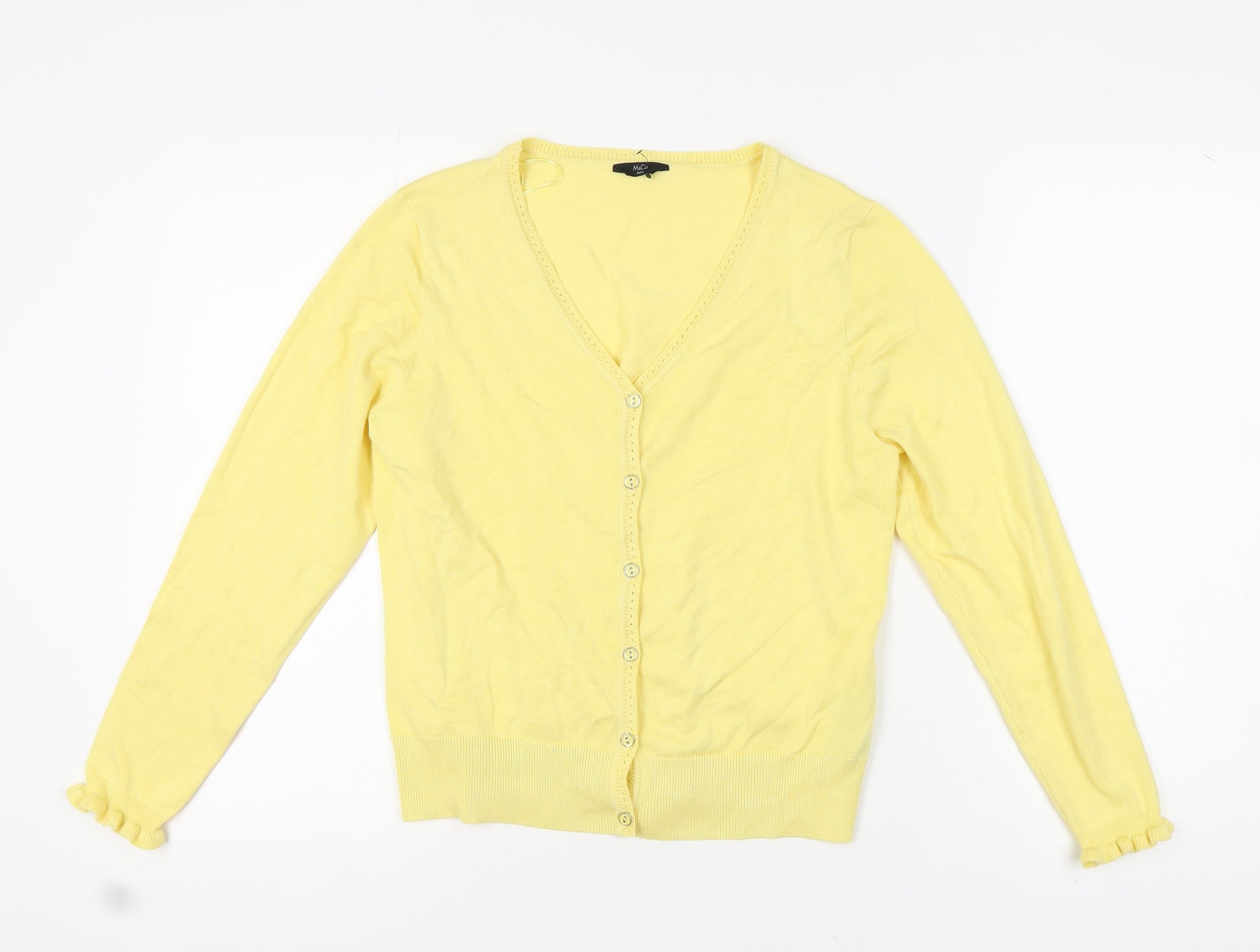 Brighten up your wardrobe with this charming M&Co Women's Cardigan in a delightful yellow hue. Crafted from a comfortable and breathable mix of 70% Viscose and 30% Nylon, this cardigan offers a soft touch and a snug fit, making it a perfect choice for both spring and summer. The cardigan is designed with a flattering V-Neckline and long sleeves, offering a classic look that can be dressed up or down. Its tight-knit fabric and button accents add a stylish touch that stands out in any casual gathering. Easy to care for and machine washable, this cardigan is ideal for everyday wear. Versatile and chic, it's well-suited for casual occasions and pairs beautifully with various ensembles. In excellent condition, with no visible signs of wear, this cardigan brings both style and comfort at an unbeatable price. A must-have addition for anyone looking to enhance their casual fashion collection.