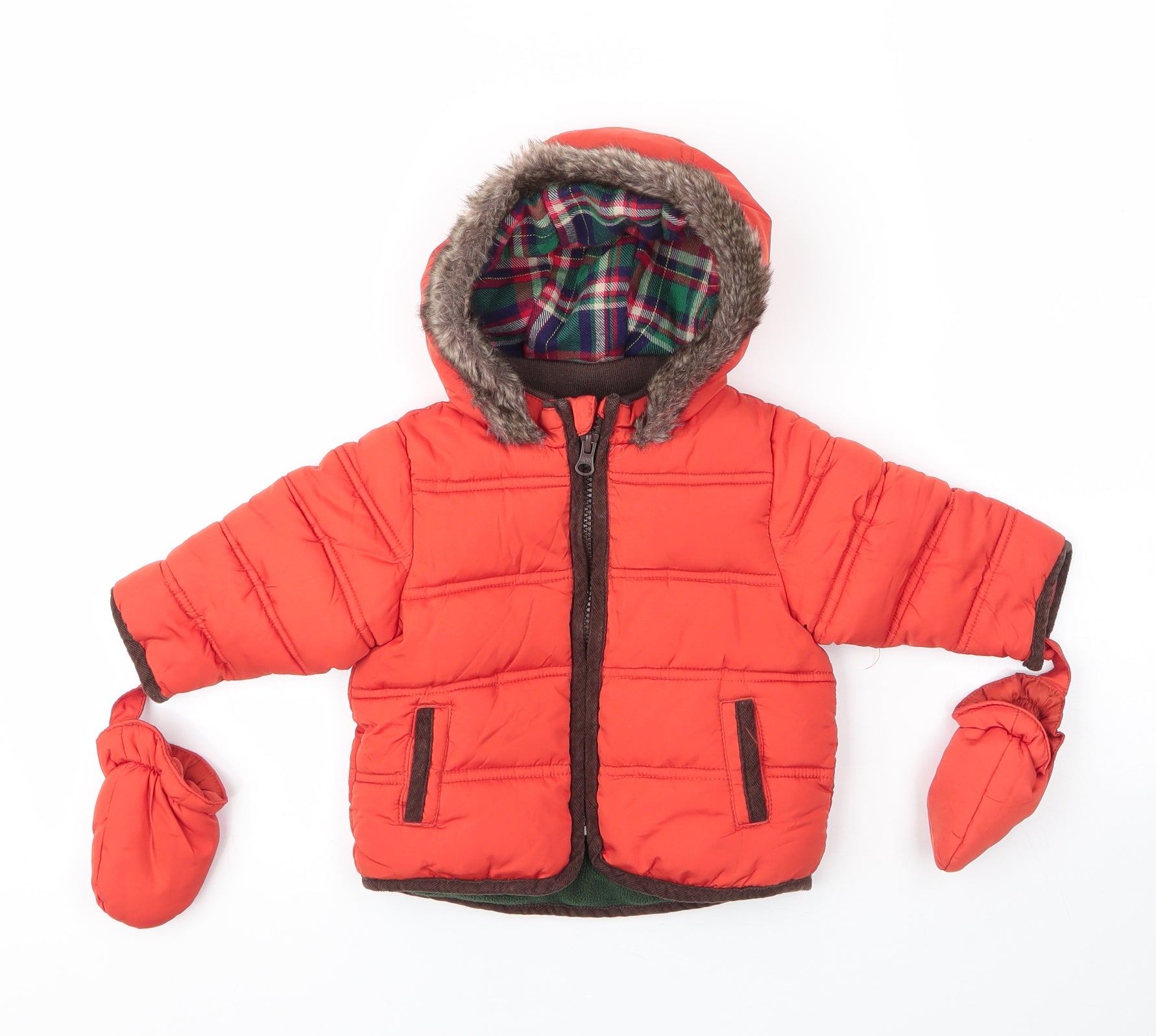 Boys Orange Parka Coat Size 3-6 Months Zip - Gloves attached