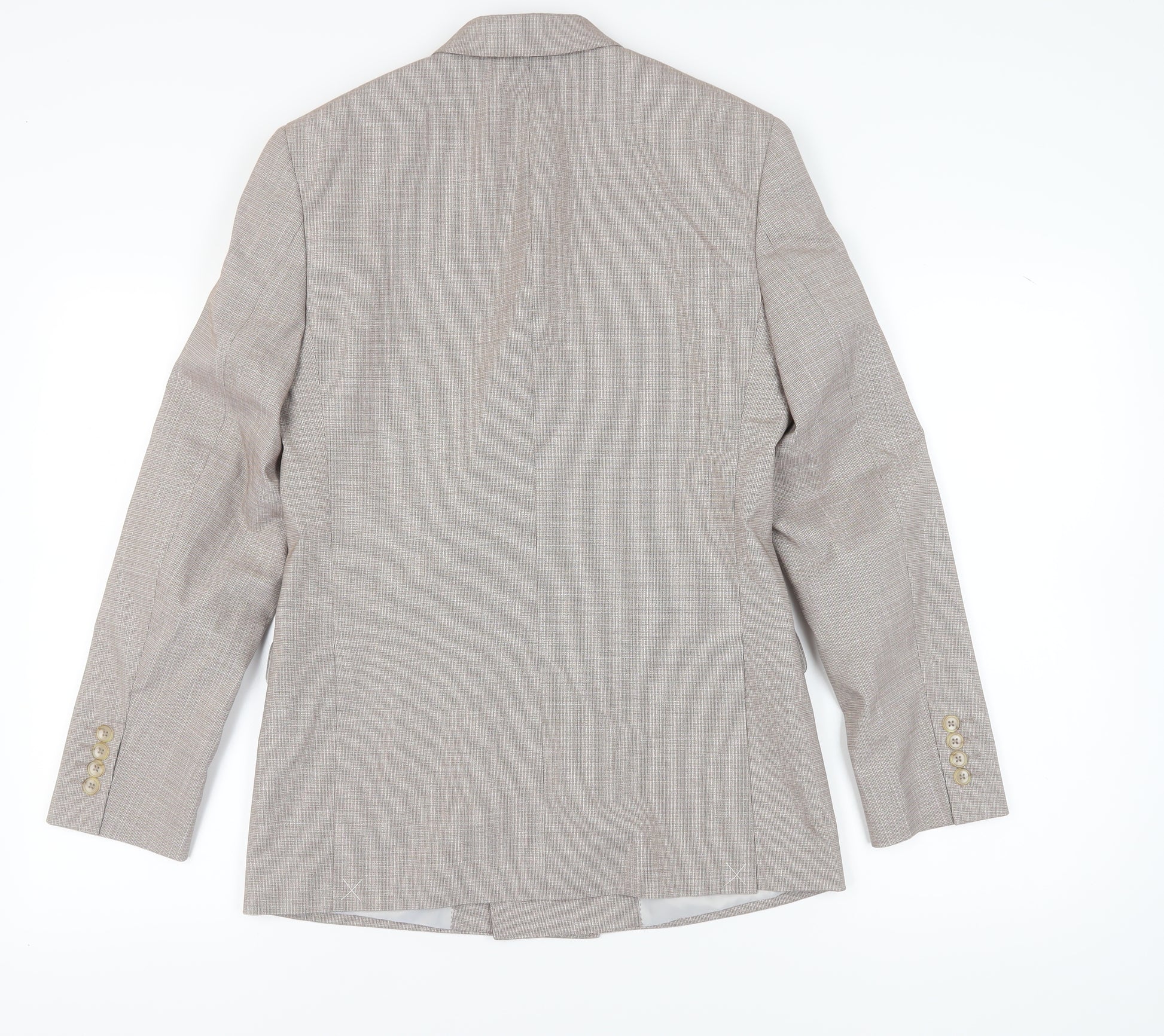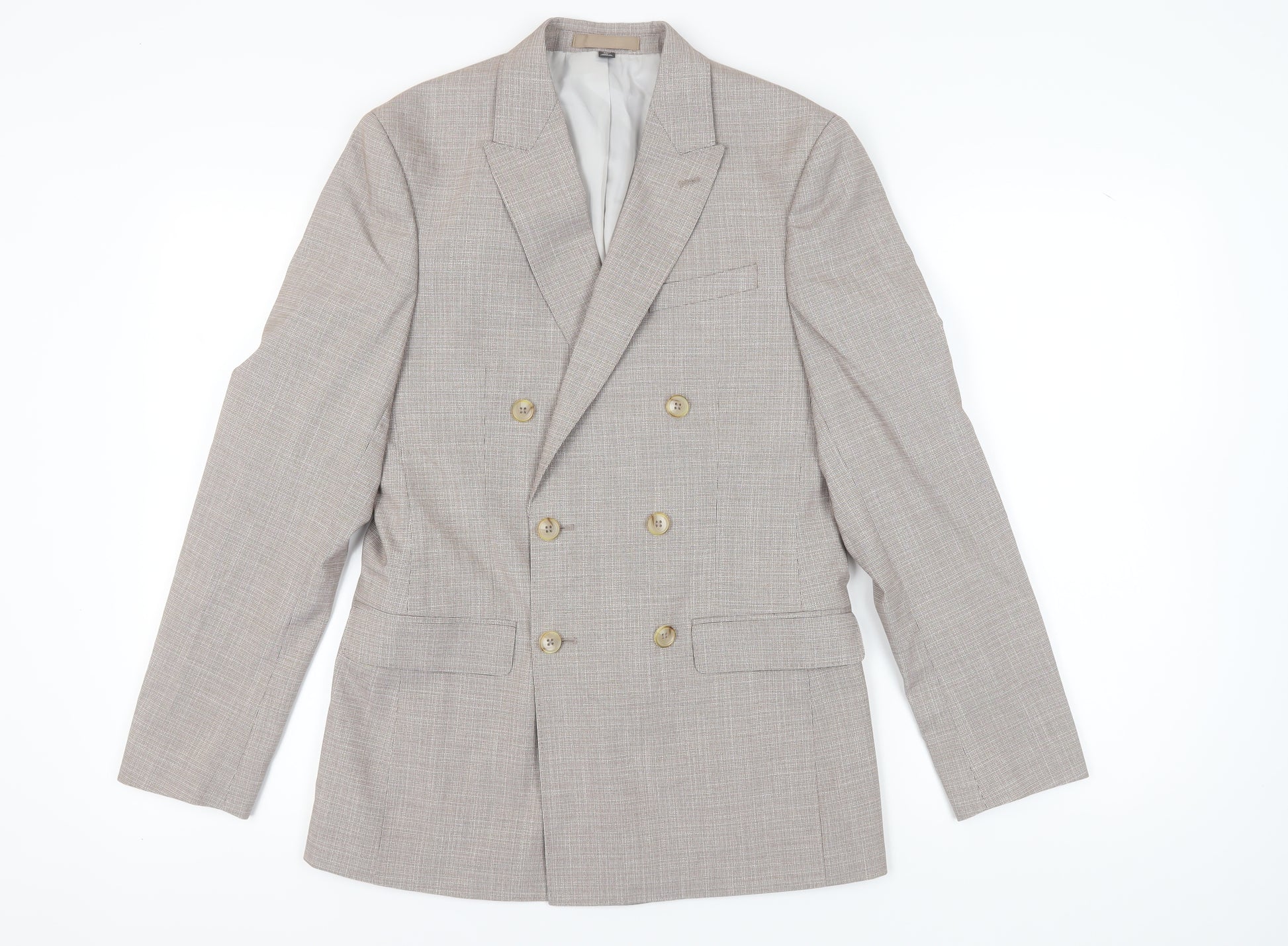 Step up your style game with this elegant beige check blazer from Marks and Spencer. Tailored for a regular fit, this double-breasted jacket brings a touch of sophistication to any ensemble. Crafted with a blend of polyester, viscose, and elastane, it offers both comfort and durability. The peak lapel design enhances its classic appeal, making it an ideal choice for a variety of occasions. Featuring a four-button sleeve accent and a double-vented back, this blazer exudes timeless elegance. The inner pockets add functionality, allowing you to carry essentials with ease. Its machine-washable fabric ensures easy maintenance, a perfect blend for the modern man on the go. Whether you're dressing up for a business meeting or adding a polished finish to a casual look, this Regular Length jacket makes a versatile addition to your wardrobe. New with tags and ready to elevate your fashion statement, this blazer is a must-have piece. Secure yours today and enjoy a sophisticated sartorial experience.