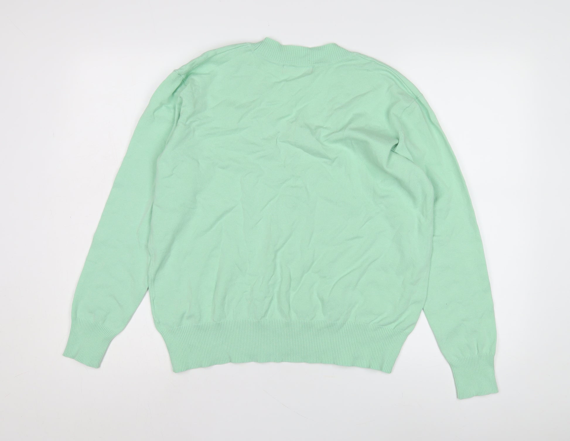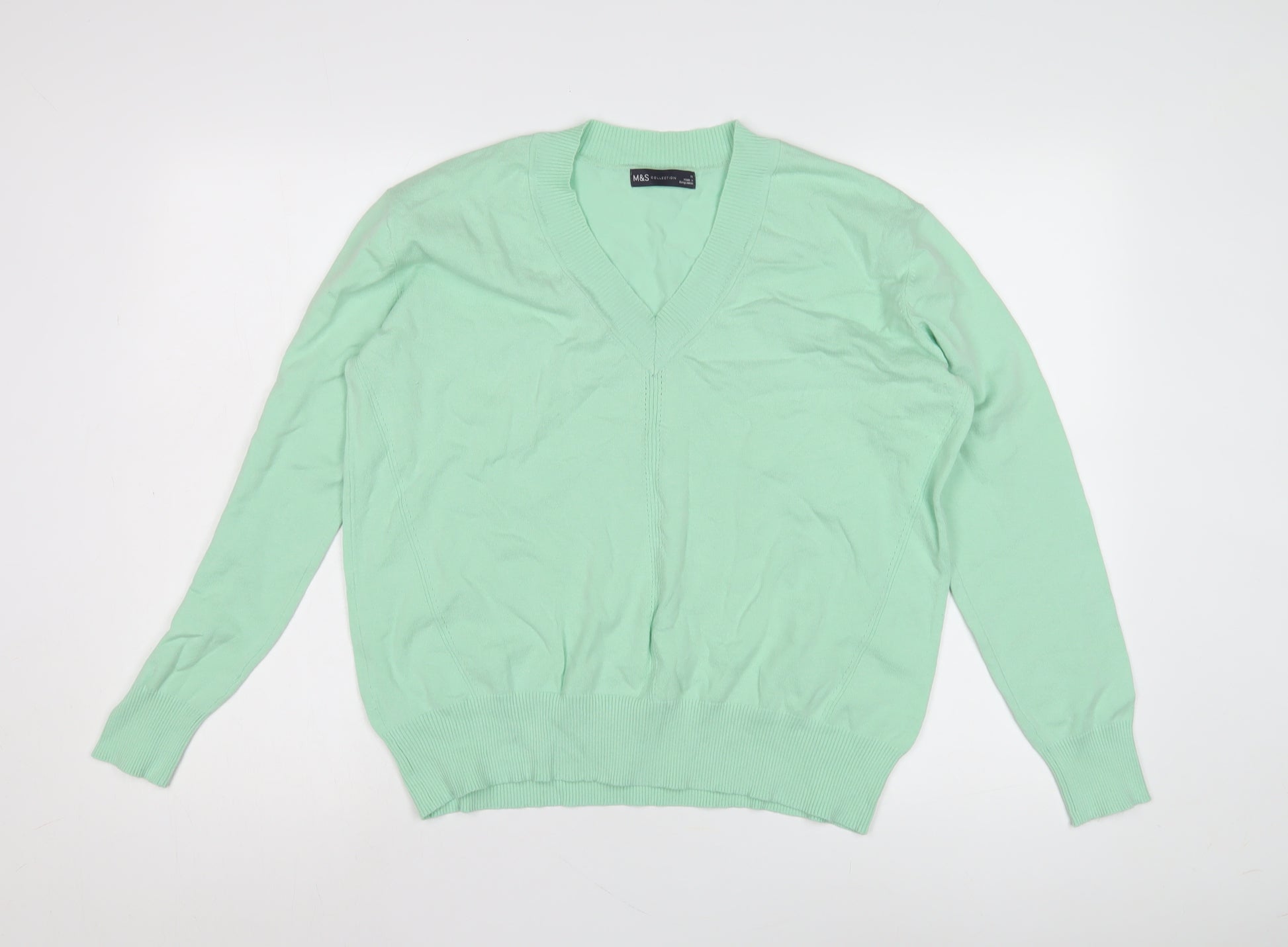 Discover comfort and style with this M&S women's green V-neck pullover jumper. Crafted from 100% cotton, this knit jumper is perfect for any casual occasion. The medium size ensures a comfortable fit, while the long sleeves provide warmth and elegance. Designed in a refreshing light green colour, this jumper is ideal for the spring and autumn seasons. Machine washable for easy care, this jumper is both practical and stylish. Whether you're dressing for a casual day out or simply lounging at home, this pullover jumper is a versatile addition to your wardrobe. In excellent condition with minimal signs of wear, it's a must-have for fashion-conscious individuals who appreciate quality and design. Add a splash of colour to your wardrobe today.