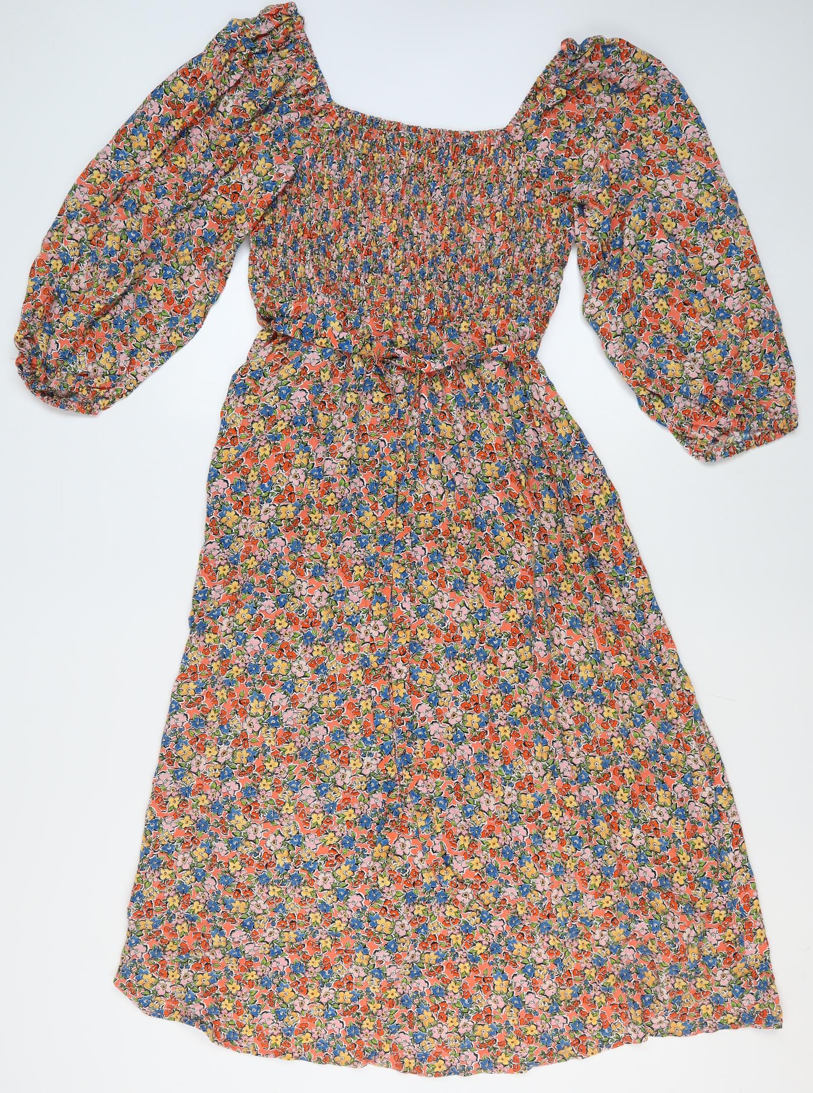 This beautiful Marks and Spencer x Ghost collaboration dress is a must-have addition to any wardrobe. Crafted from 100% viscose, the fabric drapes elegantly to create a flattering silhouette that is enhanced by its smocked bodice and charming floral pattern. This multicoloured skater dress features a stylish square neckline and playful balloon sleeves, providing a touch of bohemian flair. Perfect for spring and summer outings, its lightweight woven fabric ensures comfort and breathability throughout the day. Designed for versatile wear, this midi-length dress is ideal for casual occasions and effortlessly transitions from daytime chic to evening elegance. Easily slip it on with its convenient pullover closure and enjoy the delightful feel of the soft material against your skin. Machine washable for easy care, this dress is brand new and comes with original tags. Embrace your feminine side with this delightful floral dress, perfect for adding an enchanting touch to your seasonal collection. Whether you're heading out for a casual stroll or attending a garden party, this dress promises to keep you looking stylish and feeling confident.