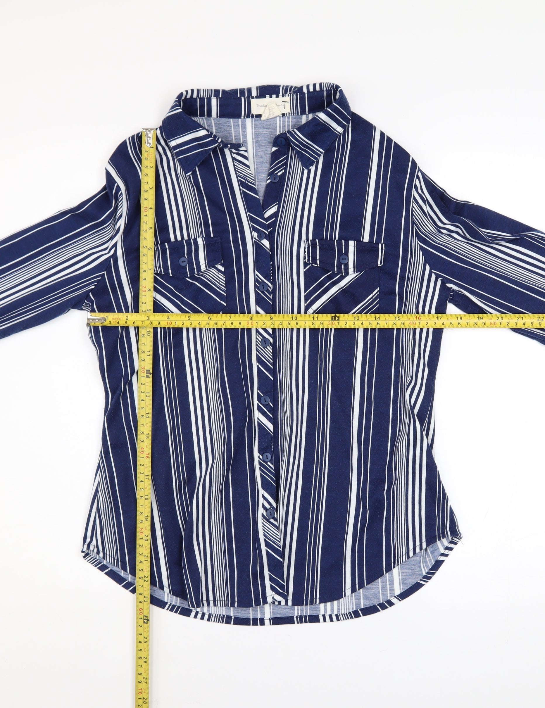 Create a timeless casual look with this Madison & Monroe Women's Blue Striped Button-Up Shirt in size Small. Crafted from 100% polyester, this lightweight woven shirt delivers breathable comfort ideal for warmer days or as a chic layering piece during transitional seasons. With its classic collared neckline and full button-down front, this top offers a flattering and versatile silhouette that transitions easily from laid-back weekends to smart-casual workwear. The navy-blue background with contrasting vertical white stripes elongates the figure, giving a polished yet effortless feel. Long fitted sleeves, buttoned cuffs, and dual front pockets add to its traditional styling while ensuring practicality and everyday wearability. The fabric is soft, easy to maintain, and machine washable, making it a simple choice for women seeking both comfort and durability. Perfect for pairing with jeans, tailored trousers, or skirts, this shirt works beautifully across spring, summer, and autumn seasons. Whether styled tucked-in for a refined look or left loose for a relaxed vibe, it remains an essential wardrobe staple. Condition is excellent with no visible flaws or marks, showing only minimal signs of gentle use. This Madison & Monroe top captures a classic appeal suitable for casual outings, coffee dates, or professional settings, bringing together timeless design and modern comfort. A perfect versatile piece to refresh any smart-casual collection while maintaining an effortlessly chic, everyday style.