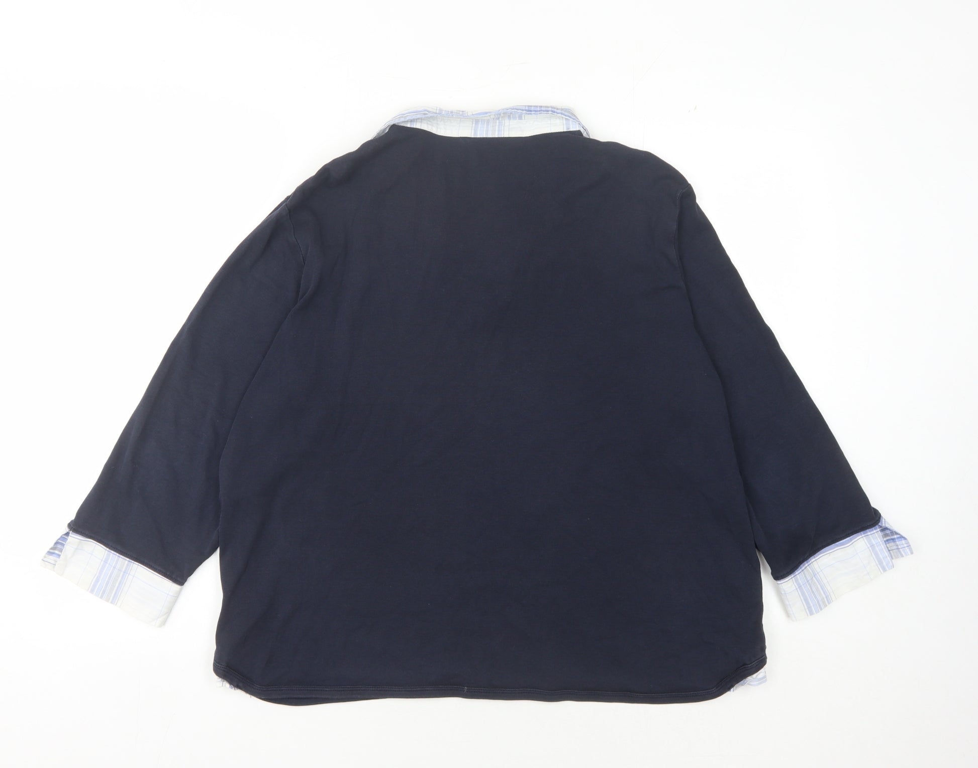 Elevate your casual wardrobe with this stylish button-up from Maine New England, perfect for women seeking comfort and style. Crafted from 100% cotton, this top offers a soft touch and exceptional breathability, ensuring comfort throughout the day. Ideal for plus-size wearers, it features a relaxed fit that drapes elegantly, complimented by classic 3/4 sleeves and a timeless collared neckline.The rich blue colour evokes elegance while the subtle solid pattern ensures versatility, seamlessly blending with any wardrobe. Designed with a pullover closure, this button-up is not only easy to wear but also ideal for layering with your favourite jewellery or scarves. Perfect for all seasons, its lightweight construction can be worn solo in warmer months and layered under jackets when the temperature drops, making it a reliable piece for year-round use.Although pre-loved, this piece remains in excellent condition, showing minimal signs of wear. Its durable cotton construction ensures long-lasting quality, while its ease of care — simply machine wash — guarantees hassle-free maintenance. Whether you're heading out for a casual day or simply lounging at home, this Maine New England button-up is a fashionable and functional choice, offering timeless appeal and unparalleled comfort.Secure your Maine New England Women's Blue Collared Button-Up today for a touch of elegance and comfort in any casual setting.