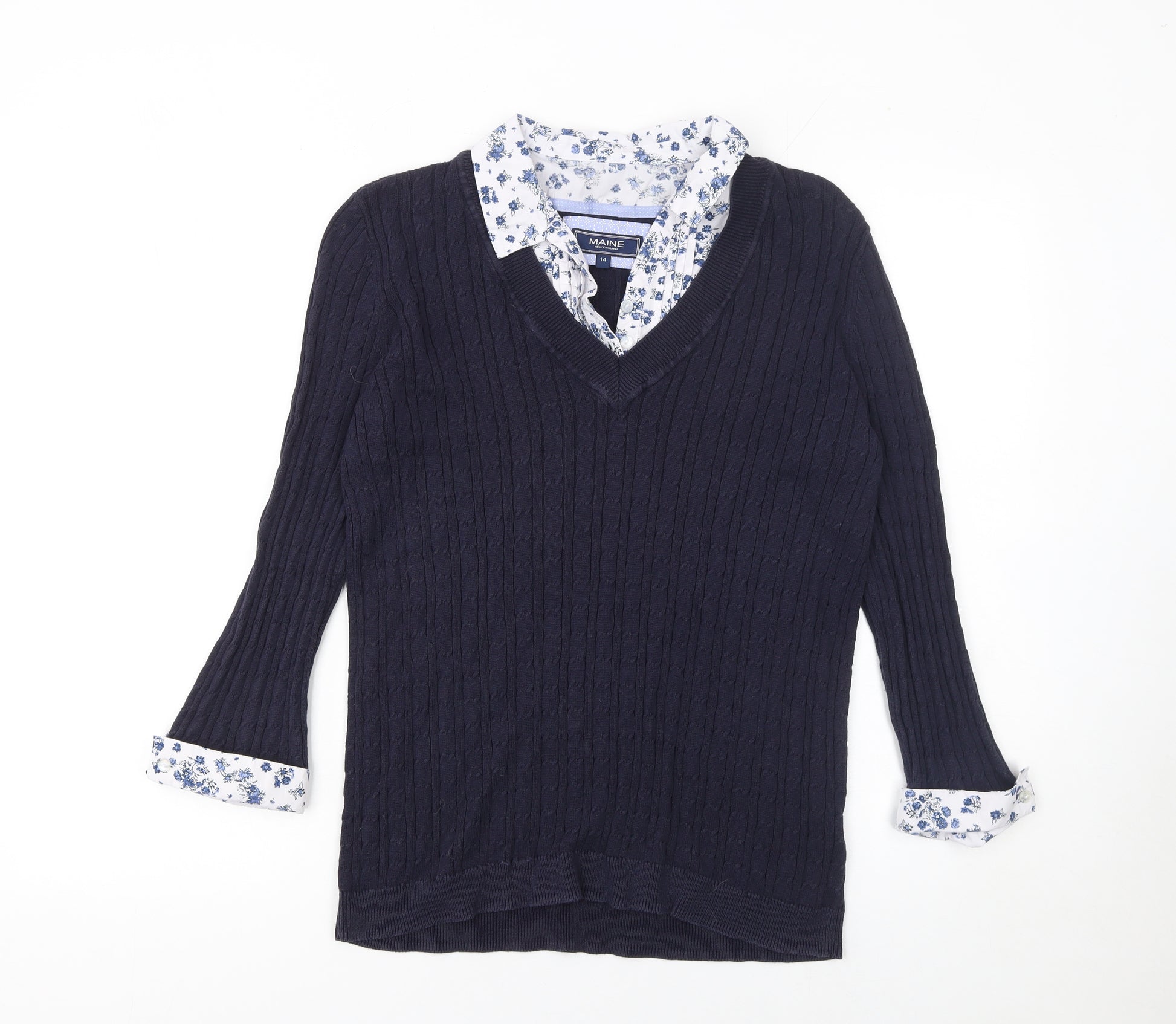 Add a touch of effortless style to your wardrobe with this beautiful Maine New England women’s V-neck jumper in size 14. Crafted entirely from soft 100% cotton, this lightweight pullover combines comfort, breathability and classic charm, making it ideal for everyday wear or layering through cooler months. The deep navy-blue shade offers a timeless, versatile look, perfect for smart-casual workdays, relaxed weekends or pairing with jeans and skirts alike.The jumper features a flattering V-neckline that subtly elongates the neck, while the cable-knit design adds texture and sophistication. Its trimmed cuffs with a floral inner shirt detail enhance its feminine appeal, allowing you to achieve that effortless layered look without extra bulk. This jumper provides a comfortable regular fit and cropped three-quarter sleeves that make it both practical and stylish for transitional seasons.Being made of 100% cotton, the piece is soft on the skin, breathable, and machine washable for easy care. The fine-knit construction ensures lasting durability and comfort, while its simple silhouette makes it incredibly easy to coordinate with your existing wardrobe.This Maine New England jumper embodies classic refinement and everyday functionality — a perfect choice whether you're dressing for a casual outing, office day or evening get-together. In excellent pre-owned condition with no visible signs of wear, it still looks fresh and elegant. An impeccable staple that delivers both quality and style without compromise.A must-have for any woman who values comfort and timeless fashion, this navy V-neck cotton jumper promises to be one of those dependable pieces you reach for time and again throughout the year.
