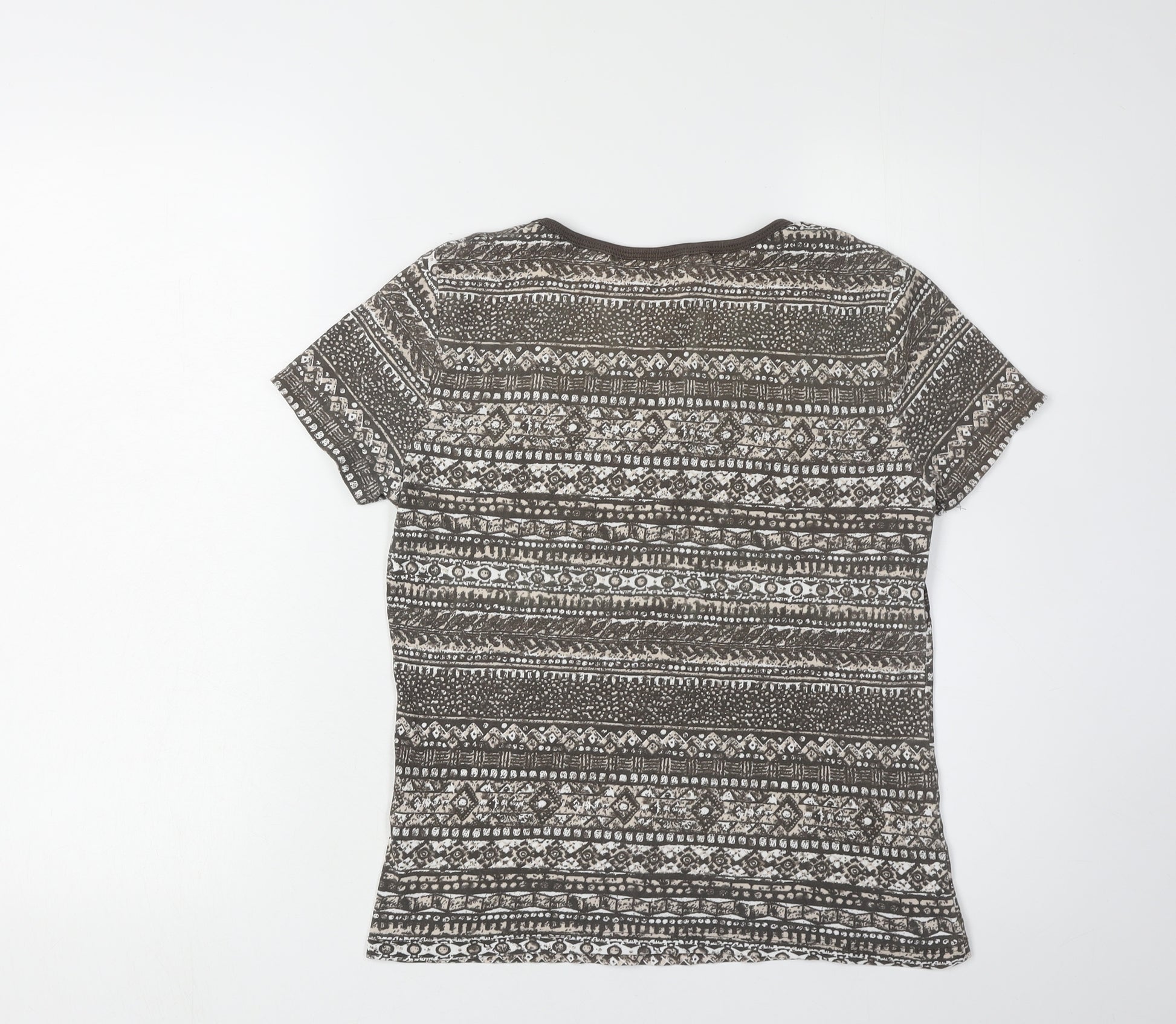 Introducing the Maine New England Women's T-Shirt in a versatile size 10, a staple piece for any wardrobe. Crafted from 100% cotton, this T-shirt ensures breathability and comfort, making it perfect for everyday wear. Its rich brown colour is enhanced by a unique geometric pattern, offering a stylish twist on a classic design. The T-shirt features a casual crew neckline and short sleeves, providing a simple yet elegant silhouette that flatters a variety of body types. Ideal for a relaxed weekend outing or casual gatherings, this piece is versatile enough to pair with jeans, skirts, or shorts. Whether you're heading to brunch or a casual meeting, this T-shirt offers both style and comfort. The quality craftsmanship is evident in its gently used condition, retained with no visible signs of wear, ensuring you get a durable addition to your collection. Despite its pre-owned status, it remains in excellent shape, ready to bring a touch of sophistication to your casual attire. Perfect for casual occasions, this T-shirt's understated elegance is sure to make it a favourite in your wardrobe. Embrace the comfort and style that comes with owning a piece from Maine New England, perfect for any season.