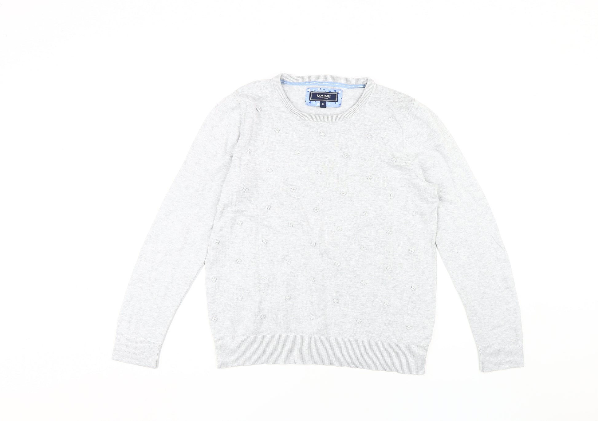 Embrace comfort and style with this Maine Women's Grey Pullover Jumper, perfectly crafted for those seeking a blend of simplicity and elegance. Made from a luxurious cotton blend with 98% cotton and 2% nylon, this jumper offers a soft, breathable feel, making it ideal for autumn and winter layering. The versatile crew neck design adds a timeless touch, while the long sleeves ensure warmth during chilly days. Its regular fit promises comfort without compromising on style, making it a perfect choice for a casual outing or a relaxed day at home. Elevate your wardrobe with this grey knit pullover that exudes understated charm, suitable for pairing with jeans or a skirt for an effortless look. Machine washable and easy to care for, this jumper is designed for convenience and long-lasting wear. Whether you're running errands or enjoying a casual dinner, this Maine jumper is an essential addition to your wardrobe that promises comfort and style in equal measure.