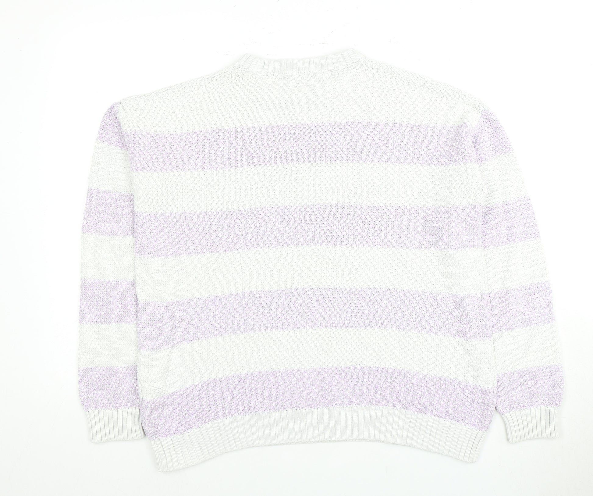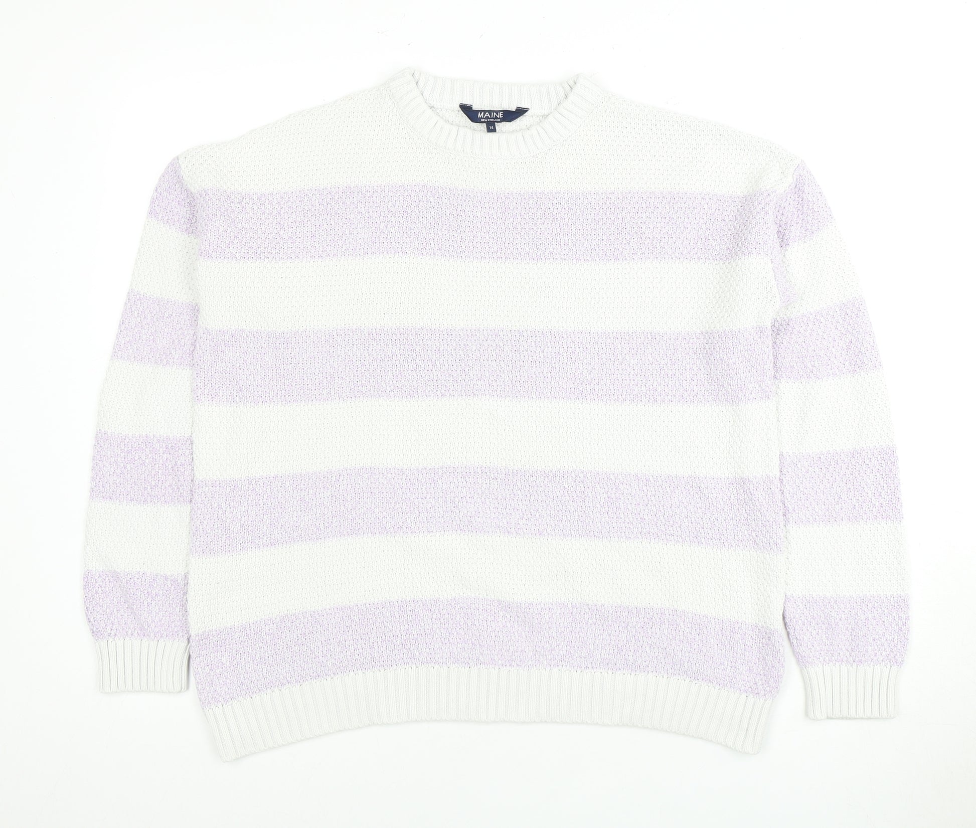 Elevate your wardrobe with this classic Maine New England women's pullover jumper. Featuring a timeless striped pattern in elegant white and lilac, this jumper offers a chic and versatile addition to your casual collection. Perfect for autumn and winter, it's designed with a comfortable crew neck and long sleeves for warmth and style. Crafted from a quality blend of 60% cotton and 40% acrylic, the knit fabric promises both durability and softness against the skin, making it suitable for all seasons. The regular fit ensures comfort without compromising on the silhouette, making it ideal for layering over shirts or wearing on its own. With machine washable care, maintaining this lovely piece is hassle-free. Whether you're heading to a casual outing or relaxing at home, this jumper offers the perfect blend of style and practicality. In excellent condition with no visible flaws or signs of wear, it's a fantastic addition to any collection. Get ready to enjoy comfort and elegance with every wear.
