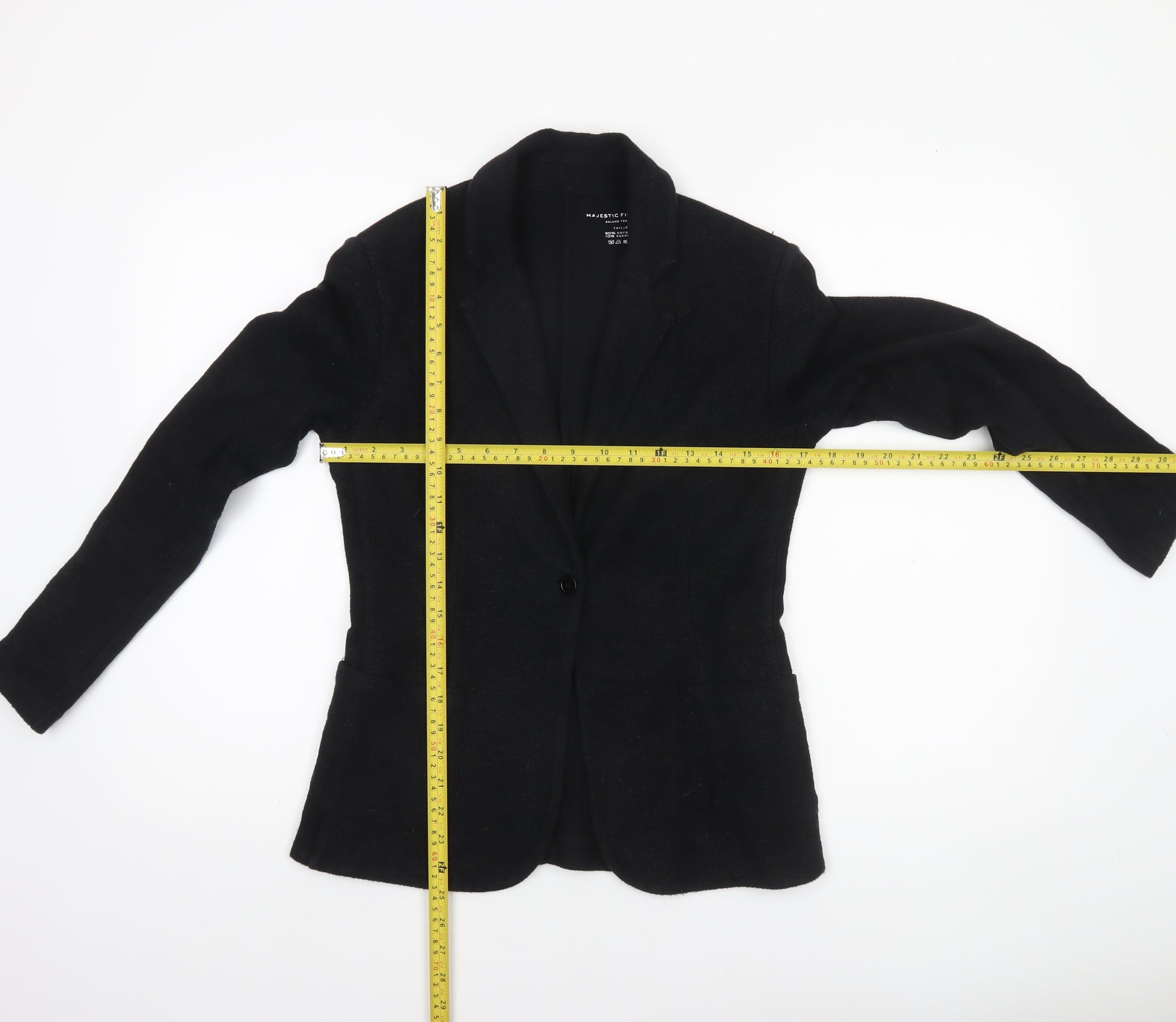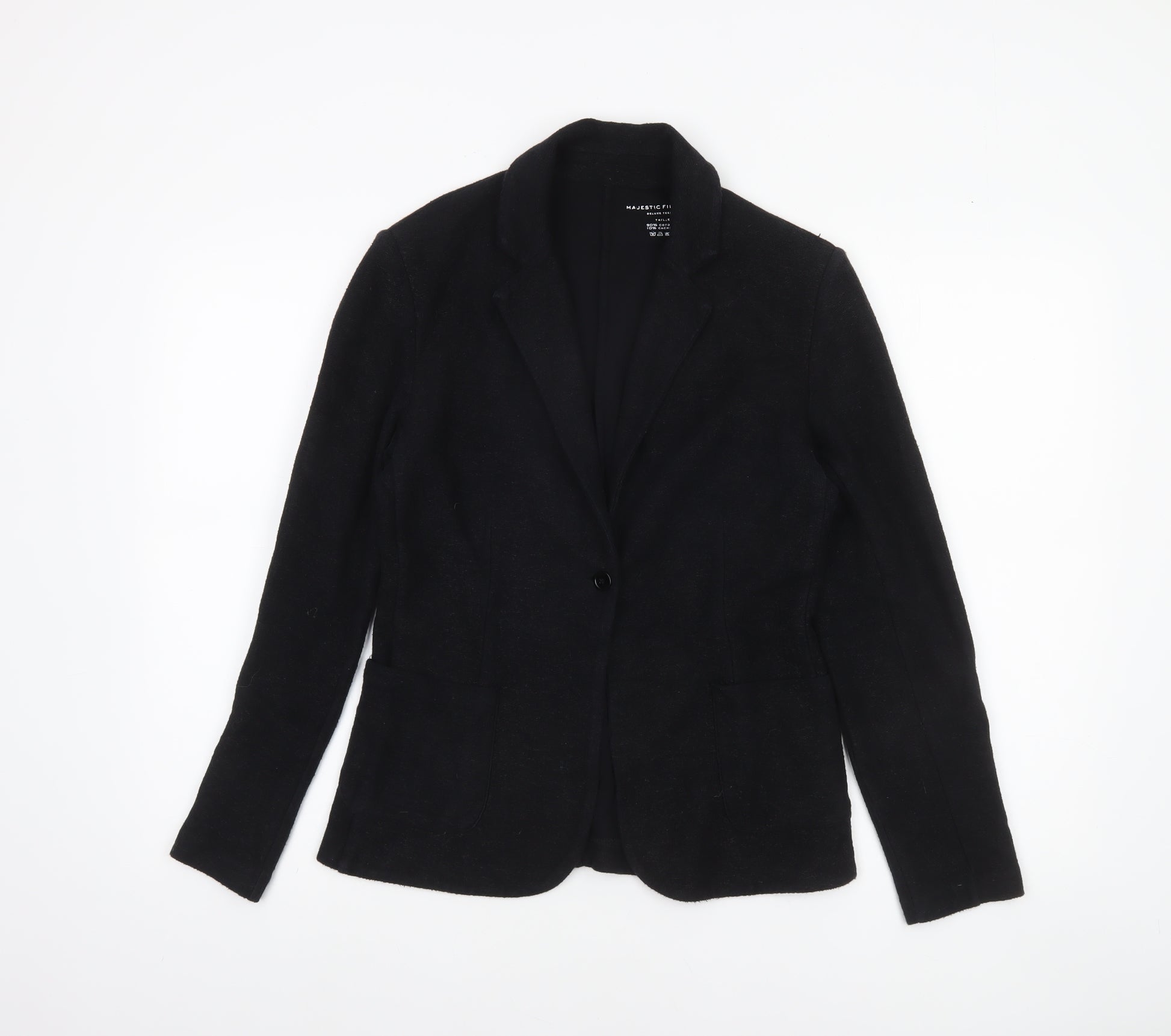 Add sophisticated Parisian flair to your wardrobe with this beautifully tailored black blazer from Majestic Filatures. Crafted in France, this refined piece is made from a luxurious blend of 90% cotton and 10% cashmere, combining the softness of cashmere with the natural breathability of cotton. The result is a jacket that feels as comfortable as it looks elegant. Styled with a single-button fastening, this classic blazer is perfect for business meetings, workwear, or smart-casual occasions that call for elevated polish. The sleek notch lapel and fitted silhouette ensure a flattering, timeless shape. Its lightweight composition allows for year-round versatility — equally suitable layered over a blouse for cool days or styled alone for a sharp office ensemble. The jacket’s single-breasted design gives it a contemporary feel while keeping the aesthetic minimalist and chic. The soft, woven texture adds subtle depth to the plain black tone, making it a wardrobe essential that pairs effortlessly with tailored trousers, skirts, or denim. Designed for the modern, confident woman, this piece embodies understated luxury. In excellent pre-owned condition with only minimal signs of previous wear, it retains its structure and fabric integrity beautifully. Whether you’re dressing for the boardroom or an evening engagement, this Majestic Filatures blazer delivers a relaxed but refined look. A must-have investment piece for anyone who values timeless elegance with a whisper of casual ease, offering the ideal balance between style, comfort, and quality craftsmanship.