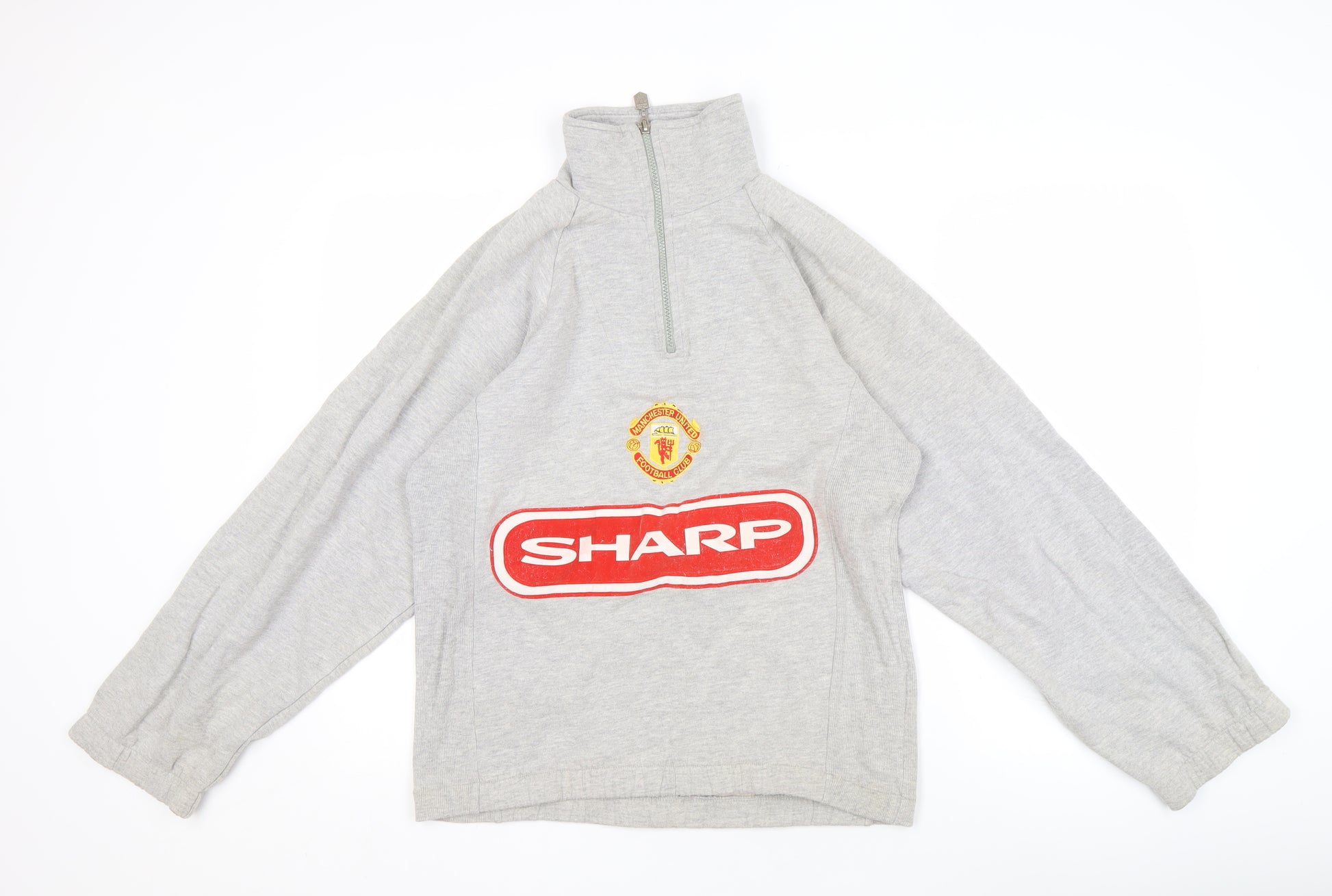 Show your support for Manchester United Football Club with this comfortable grey sweatshirt. Perfect for any fan, this lightweight fleece is crafted from a cotton and polyester blend, ensuring comfort and durability. The stylish 1/4 zip design gives it a sporty edge while the authentic Manchester United crest and Sharp logo add a touch of team pride. Ideal for casual outings, sports activities, or simply lounging at home, its high neck offers added warmth. Despite showing minimal signs of wear, this sweatshirt is still in excellent condition, making it a must-have piece for any dedicated fan. Designed for men, it features long sleeves and a regular fit, making it suitable for all seasons. Stay fashionable while supporting your favourite team with this classic piece that's both practical and stylish. Machine washable for easy care, this sweatshirt is sure to become a staple in your wardrobe.