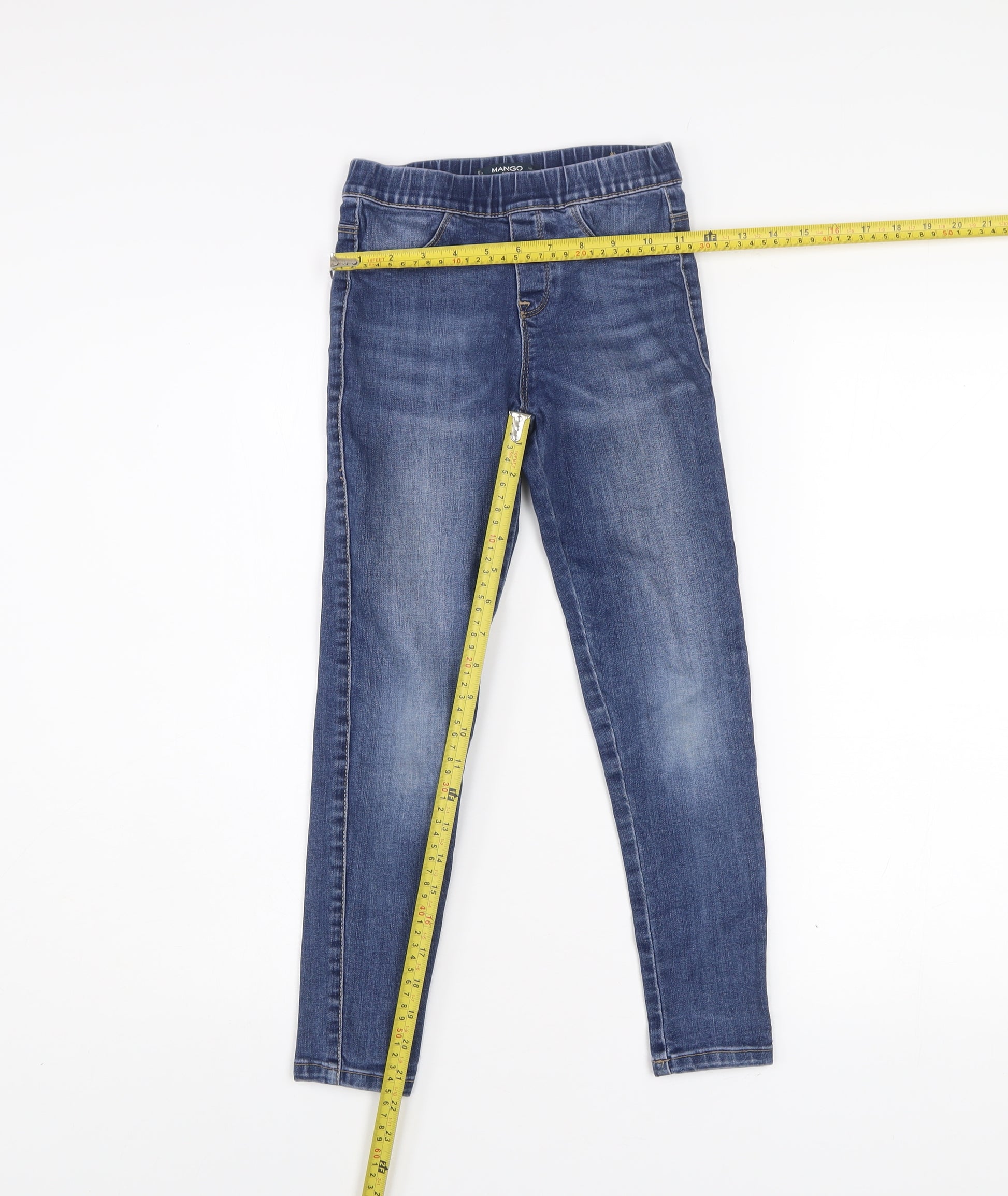 These Mango Kids girls' jegging jeans are a versatile wardrobe essential, perfect for everyday wear and play. Designed for 9-year-olds, they come in a medium blue wash with a slim fit cut, offering the look of jeans with the comfort of leggings. The soft denim blend features 72% cotton, 23% polyester, 3% viscose, and 2% elastane, creating a breathable, stretchy fabric that ensures a flexible and comfortable fit throughout the day. The mid-rise elasticated waistband adds convenience and enhances comfort while allowing easy pull-on styling without the need for buttons or zips. Featuring classic five-pocket styling to provide practicality while maintaining a modern silhouette, these jeans offer a timeless look that pairs seamlessly with t-shirts, jumpers, and jackets. The medium wash blue denim adds a casual yet polished touch, making them suitable for school, play, or casual outings. Built with a jegging style, they combine the sleek profile of skinny jeans with stretch for active youngsters. Functional back pockets and stylish stitch detail add a polished finish. The denim fabric ensures durability while the elastane content allows for unrestricted movement, making these jeans ideal for active children. Suitable across all seasons, from spring outings to layering in winter, these Mango jeggings are versatile and reliable. Fully machine washable, they are easy to care for, making them practical for busy families. In excellent pre-loved condition, these jeans show minimal signs of wear and maintain their colour and shape well. A fantastic everyday option at a fraction of the new retail price, these Mango jegging jeans combine style, quality, and functionality. A great value find for parents looking for dependable and stylish jeans for their child’s everyday wardrobe.