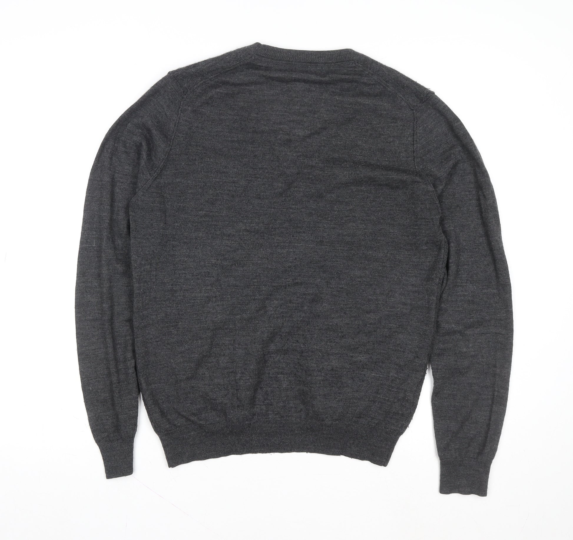 This sophisticated grey wool cardigan from Mango offers the perfect blend of timeless style and comfortable wear. Crafted for men, this cardigan features a smart V-neck design with a classic button front, ensuring effortless versatility whether layered over a shirt for a business-casual ensemble or worn casually over a T-shirt. The fine knit texture and tight-knit construction provide a lightweight yet warm feel, ideal for both autumn and winter months. Two front pockets add a practical touch while maintaining a clean, modern aesthetic. Made from pure wool, the material ensures breathability, natural insulation, and a soft hand feel. The cardigan comes in a regular fit for easy movement and lasting comfort. Its minimalist design with no bold patterns makes it a wardrobe essential, perfect for wearing at the office, on casual outings, or during travel. The condition is excellent, showing only slight fabric wear but no visible damage, pilling, or stains. This versatile piece demonstrates the understated quality expected from Mango’s menswear line and works well when layered with trousers or jeans. Whether you’re updating your work wardrobe or searching for an everyday classic layer, this grey wool cardigan delivers both style and substance. Add this timeless and refined item to your collection for an effortlessly polished look that combines comfort, warmth, and sophistication.