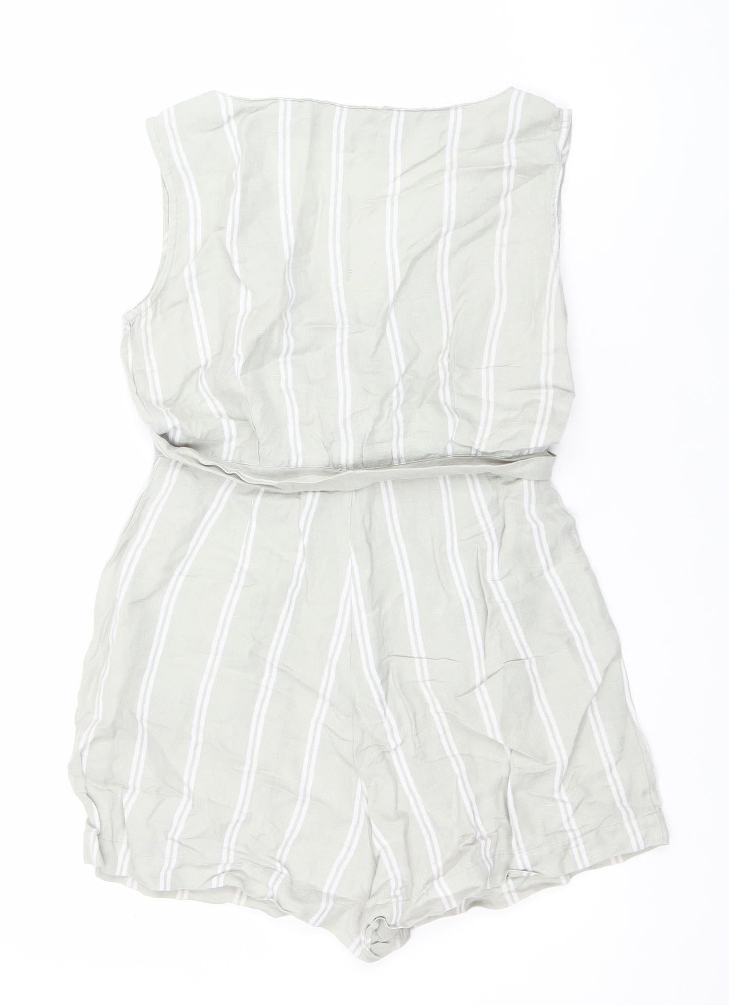 Women Beige Striped Linen Viscose Tie Front Sleeveless Playsuit XS