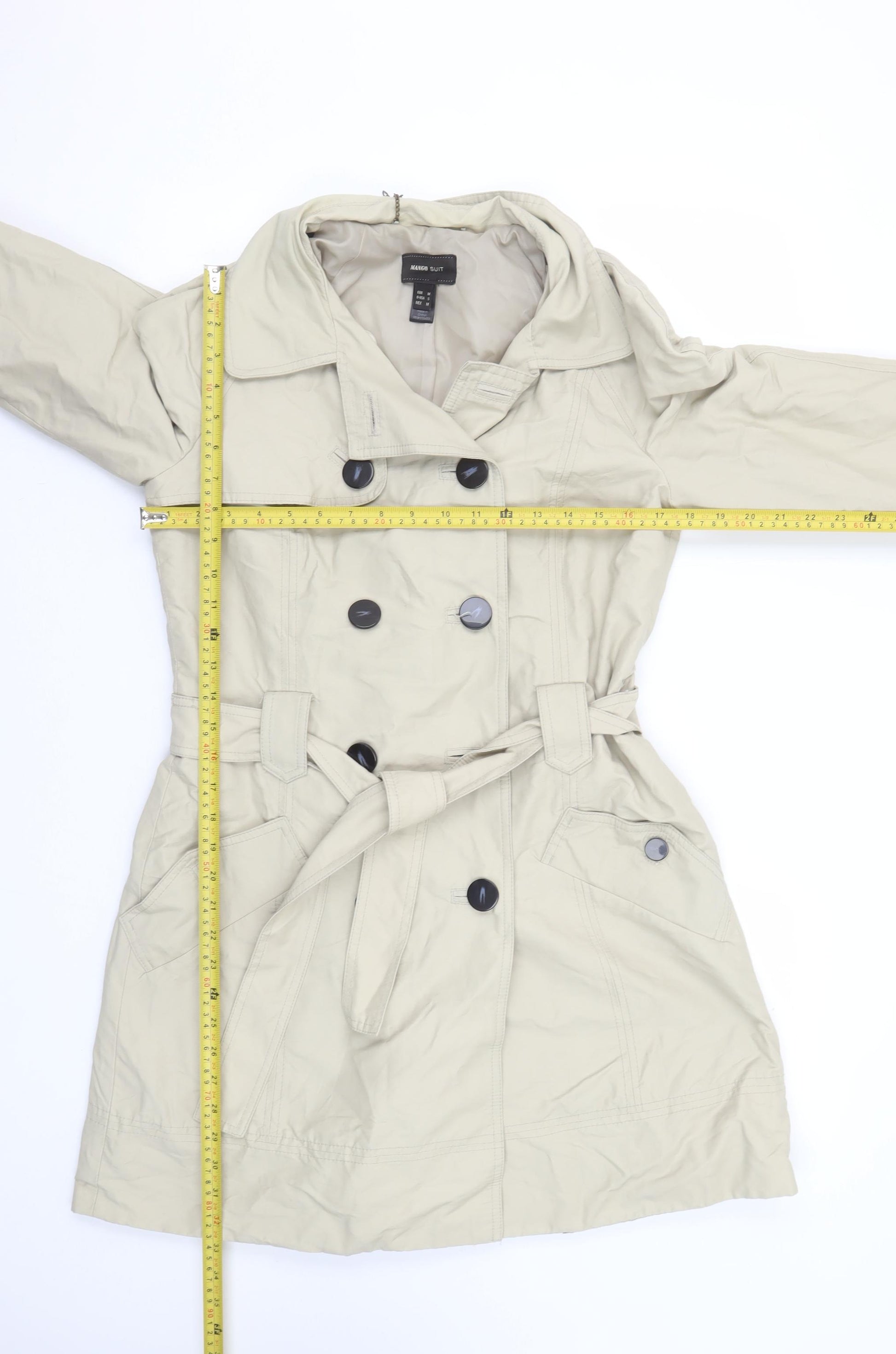 Elevate your outerwear collection with this elegant beige trench coat from Mango. Designed for women who appreciate timeless sophistication and comfort, this mid-length trench coat effortlessly combines sleek structure with practical details. Crafted from a quality cotton blend (70% cotton, 30% polyamide), the coat offers both durability and softness, ensuring it retains its shape beautifully while providing a lightweight feel ideal for transitional seasons like spring and autumn. The 100% polyester lining adds a smooth touch, allowing for ease of layering over work or casual outfits.Featuring a classic double-breasted front with statement buttons and a matching fabric belt, this coat defines the waist for a flattering silhouette. The structured collar and long sleeves enhance its traditional trench coat styling, while front pockets offer both function and elegance. Its neutral beige colour makes it incredibly versatile—perfect for pairing with tailored trousers for business wear or jeans for a casual weekend look.The Mango trench coat exemplifies understated sophistication, offering a polished finish whether worn open or belted. Its regular fit ensures comfort without compromising on style, and meticulous stitching adds a refined touch that aligns with Mango’s high-quality standards. With a clean, minimalist aesthetic, this piece transitions seamlessly from office attire to evening outings, making it a must-have wardrobe staple.In excellent pre-loved condition, this coat shows only minimal signs of wear such as slight creasing and remains ready to wear with plenty of life left. Ideal for the modern, style-conscious woman seeking a wardrobe essential that combines functionality, versatility, and effortless elegance. Step out with confidence in a coat that truly complements every season and occasion. Own this beautiful Mango trench coat today and elevate your look with timeless appeal.