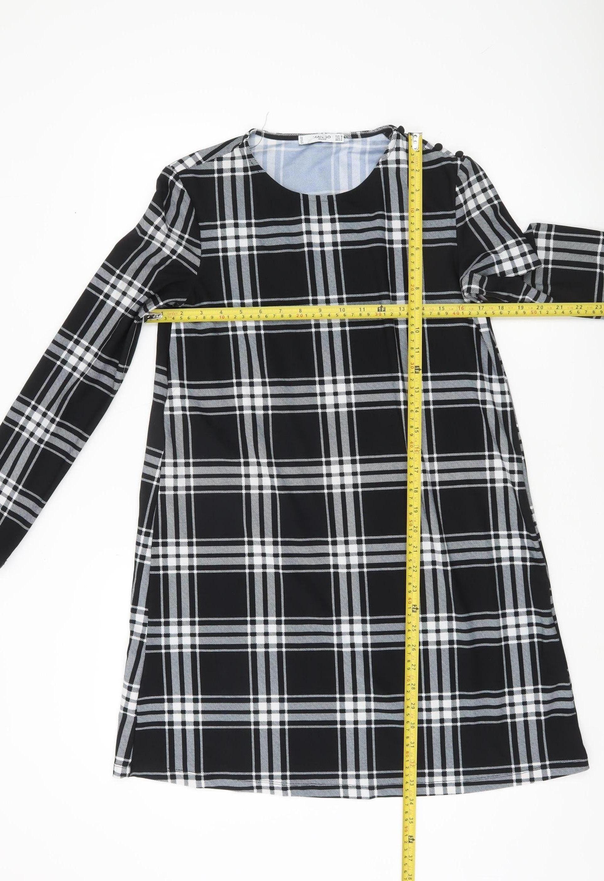 This stylish Mango Women's Black Check Long Sleeve Shift Dress in size 10 is perfect for both workwear and everyday occasions, making it a versatile wardrobe staple. The dress features a classic black and white check pattern, offering a timeless look that pairs effortlessly with boots, heels, or flats. Designed in a flattering shift style, it provides a comfortable yet chic silhouette suitable for business, casual or work settings. Constructed from a soft jersey fabric blend of 95% polyester and 5% elastane, the dress offers both comfort and stretch for ease of wear throughout the day. The lightweight and breathable material makes it ideal for layering during the cooler months, particularly autumn and winter, while still offering enough style to be worn alone during transitional weather. Its round neckline keeps the look elegant and versatile, while the pullover closure ensures hassle-free dressing.The long sleeves add both warmth and sophistication, making this dress a practical choice whether you're heading into the office, a meeting, or a casual social outing. The classic check design also lends the dress a modern yet professional appeal that remains stylish season after season. As part of Mango's Basics collection, this piece delivers the perfect balance of timeless design and everyday wearability.This dress is in excellent pre-loved condition with no visible signs of damage, ensuring plenty of wear left for its next owner. Machine washable for easy care, it’s a low-maintenance but highly versatile addition to your wardrobe. With thoughtful features including comfort stretch and lightweight construction, it ensures all-day wearability without compromising on style. Ideal for women who value classic, versatile pieces, this Mango shift dress will serve as a reliable choice for work, casual outings, and business occasions. Don't miss the opportunity to add this fashionable yet practical piece to your collection at an excellent price.