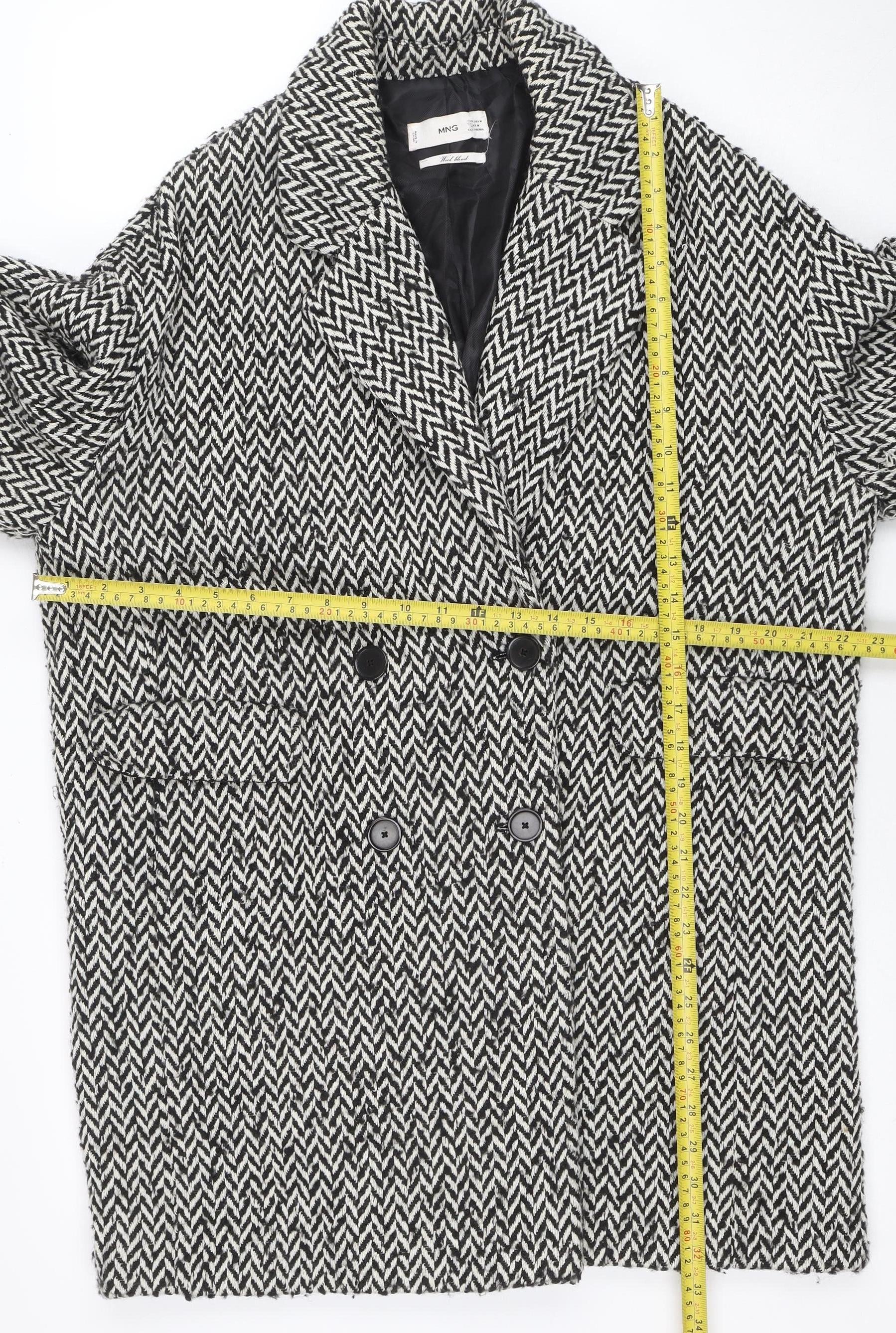 Elevate your wardrobe with this timeless Mango women’s herringbone coat. Designed in a sophisticated black and white tweed pattern, this piece offers a beautiful blend of contemporary style and classic tailoring. Crafted from a premium combination of wool, polyester, and acrylic, it delivers a warm yet breathable finish, ideal for autumn and winter layering. The coat features a button closure that adds elegance to its clean silhouette, while the soft lining ensures a comfortable fit. The long sleeves and mid-length cut offer reliable coverage and a streamlined appearance that pairs effortlessly with both casual and business attire. Practical side pockets complete the design, adding convenience without compromising on polish. The regular fit gives a flattering drape for easy movement, while the detailed herringbone pattern provides subtle texture, enhancing its refined look. Suitable for workwear or smart-casual outings, this coat delivers sophistication for chilly days and evenings alike. Expert craftsmanship from Mango ensures lasting wear with attention to every stitch and finish. The neutral tone complements a wide range of outfits, making it a versatile outerwear choice you will reach for season after season. Perfect for women who appreciate quality, this wool-blend coat embodies understated style with enduring appeal. Pair it with jeans and boots for an elevated casual ensemble, or layer over a dress and heels for a professional finish. Whether heading to the office or enjoying weekend outings, this mid-length herringbone coat offers a smart balance of fashion and practicality, promising to become a wardrobe essential for years to come.