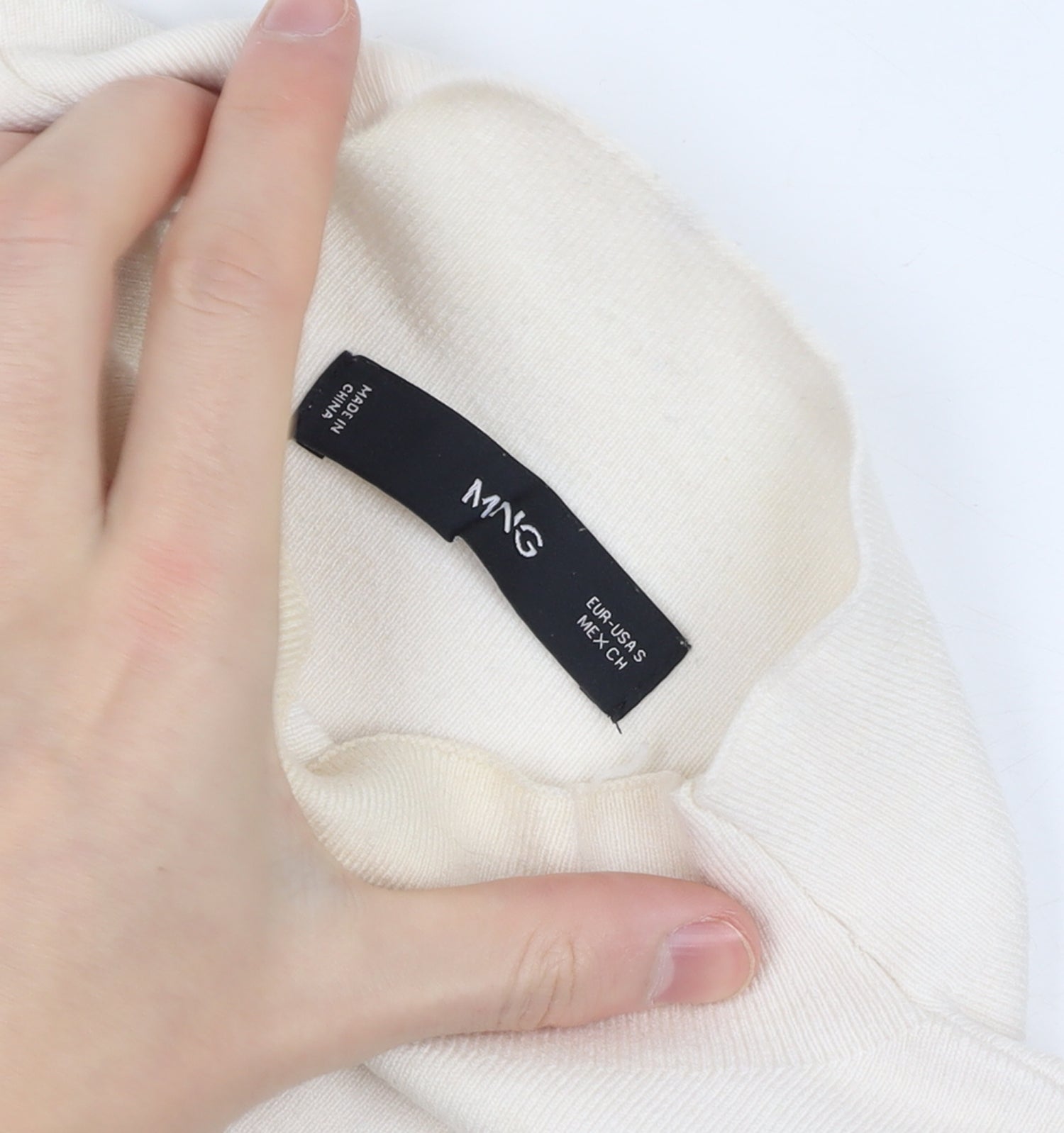 This classic women’s ivory mock neck jumper by Mango offers a timeless minimalist design suitable for multiple occasions. Crafted from a soft blend of viscose, polyester, and polyamide, this lightweight knit provides both comfort and durability, ensuring an elegant drape and cosy wear throughout the season. Featuring a mock neckline that gives a neat and modern silhouette, the jumper’s long sleeves and regular fit make it perfect for layering under coats or pairing with skirts and jeans for a refined casual look. The tight-knit fabric gives a smooth texture, making it an essential staple piece for cooler months.Designed for comfort and versatility, this Mango jumper works beautifully for everyday wear, from casual outings to relaxed workplace settings. Its neutral ivory shade makes it effortlessly compatible with any wardrobe palette. While gently used, there are some light marks on the sleeves and neckline, reflected in the affordable price. Despite minor signs of previous wear, the overall garment integrity and shape remain intact, providing many more wears ahead. The natural stretch within the fabric blend ensures freedom of movement without losing structure, while the lightweight construction makes it ideal for transitional weather.Perfect for autumn, winter, or spring layering, this piece combines simplicity and sophistication. Pair it with tailored trousers for a more polished look or wear with denim for a laid-back, chic feel. With its understated design and flattering cut, this Mango mock neck knit jumper is a versatile must-have addition to every modern wardrobe, offering comfort, elegance, and effortless style all in one.