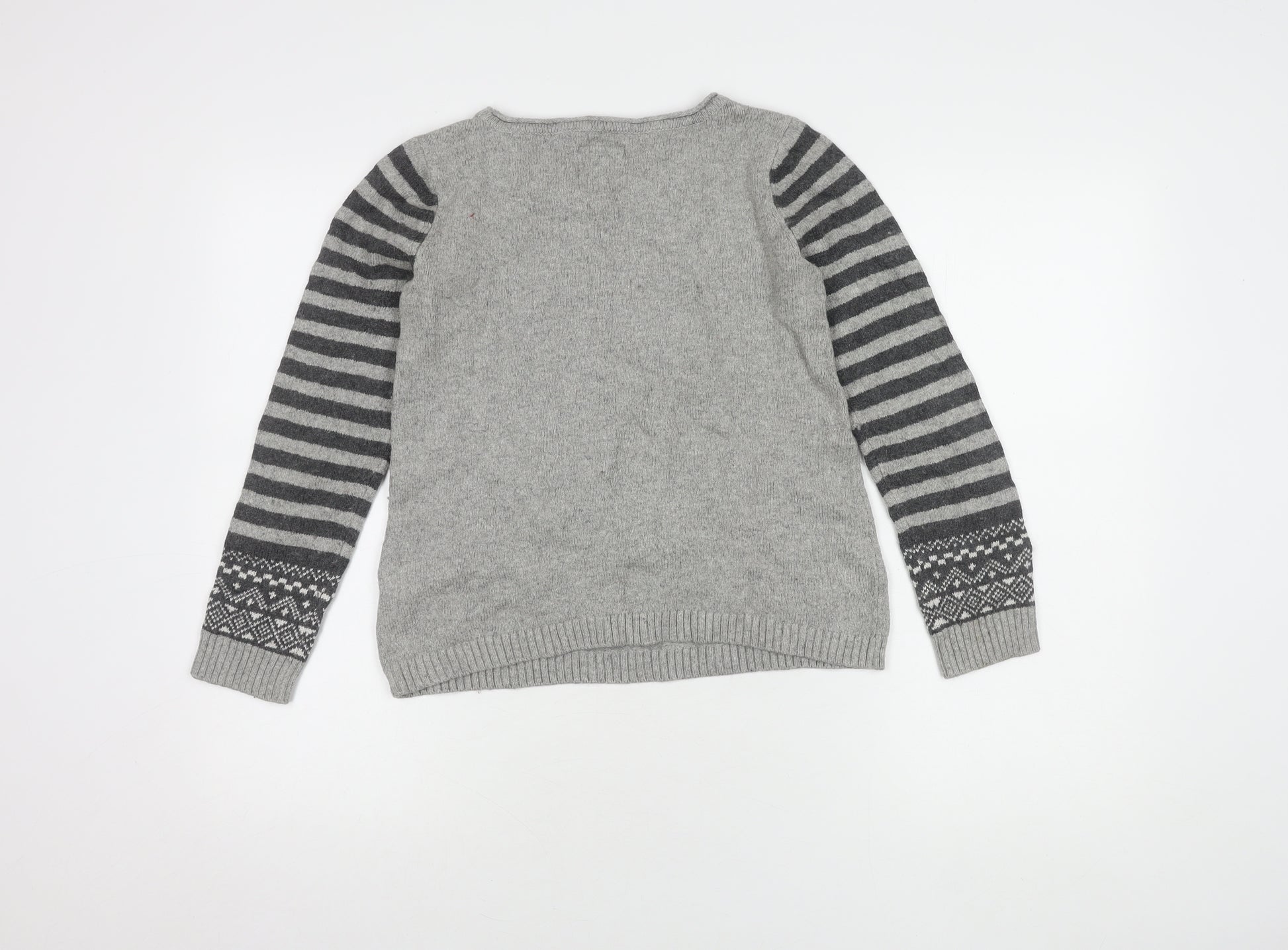 Stay stylish and cosy with this Mantaray girls' grey penguin jumper, perfect for casual winter days. Crafted from a soft blend of cotton, viscose, nylon, and wool, this pullover jumper ensures comfort and warmth. The charming penguin graphic at the front adds a playful touch, while the Fair Isle pattern and stripes lend a delightful wintry feel. Designed with a crew neckline and long sleeves, this jumper is easy to wear and pairs wonderfully with jeans or leggings for a snug ensemble. Ideal for animal and sports enthusiasts, this piece is machine washable for convenient care. In excellent condition with no visible defects, it makes a charming addition to any young girl's wardrobe. Don't miss the opportunity to gift this lovely jumper for a festive occasion or to simply update her winter wardrobe. Secure your piece today and let her embrace winter in style.