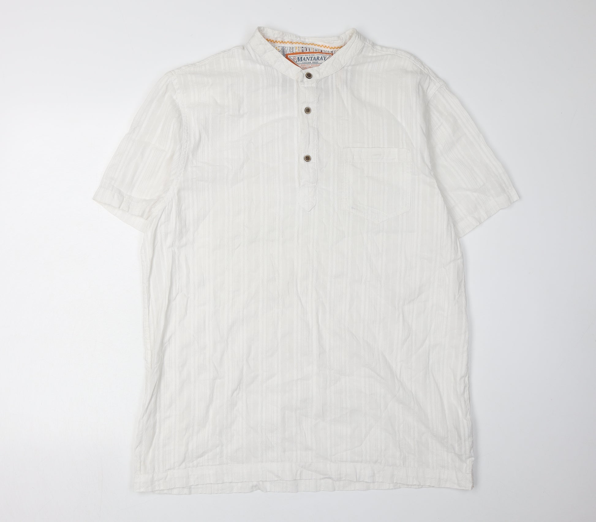 Embrace casual elegance with this Mantaray Men's Henley T-Shirt in classic white. Crafted entirely from premium cotton, this woven short-sleeve design promises comfort and breathability for all-day wear. The Henley neckline, accented with buttons, adds a touch of style to a timeless piece, making it a versatile addition to any wardrobe. Ideal for any season, it's perfect for layering or worn alone. The solid pattern makes it easy to pair with jeans or shorts, whether you're heading out for a casual day out or relaxing at home. With its new condition and Mantaray's commitment to quality, this T-shirt offers durability and style. Grab this must-have item and elevate your casual wear with a brand known for effortlessly stylish menswear.