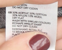Introducing the elegant Mantaray Women's Grey Cardigan, a versatile addition to your wardrobe, perfect for embracing the cool breezes of autumn and winter. Crafted from a comfortable blend of acrylic, cotton, nylon, and wool, this cardigan promises not only warmth and style but also durability. Its understated grey hue offers a timeless appeal, ensuring it pairs effortlessly with a wide range of outfits.The cardigan, designed with a relaxed fit and long sleeves, is ideal for layering over your favourite tops and dresses. Whether you're heading out for a casual day with friends or running errands, its cozy knit fabric will keep you snug while still offering a breathable wear.Machine washable for easy care, this piece is not only stylish but also fuss-free. While in very good condition, please note the presence of minor stains, which are hardly noticeable when styled creatively.Get ready to experience a blend of comfort and fashion with this Mantaray cardigan. It's perfect for casual outings and will quickly become a staple in your seasonal collection.