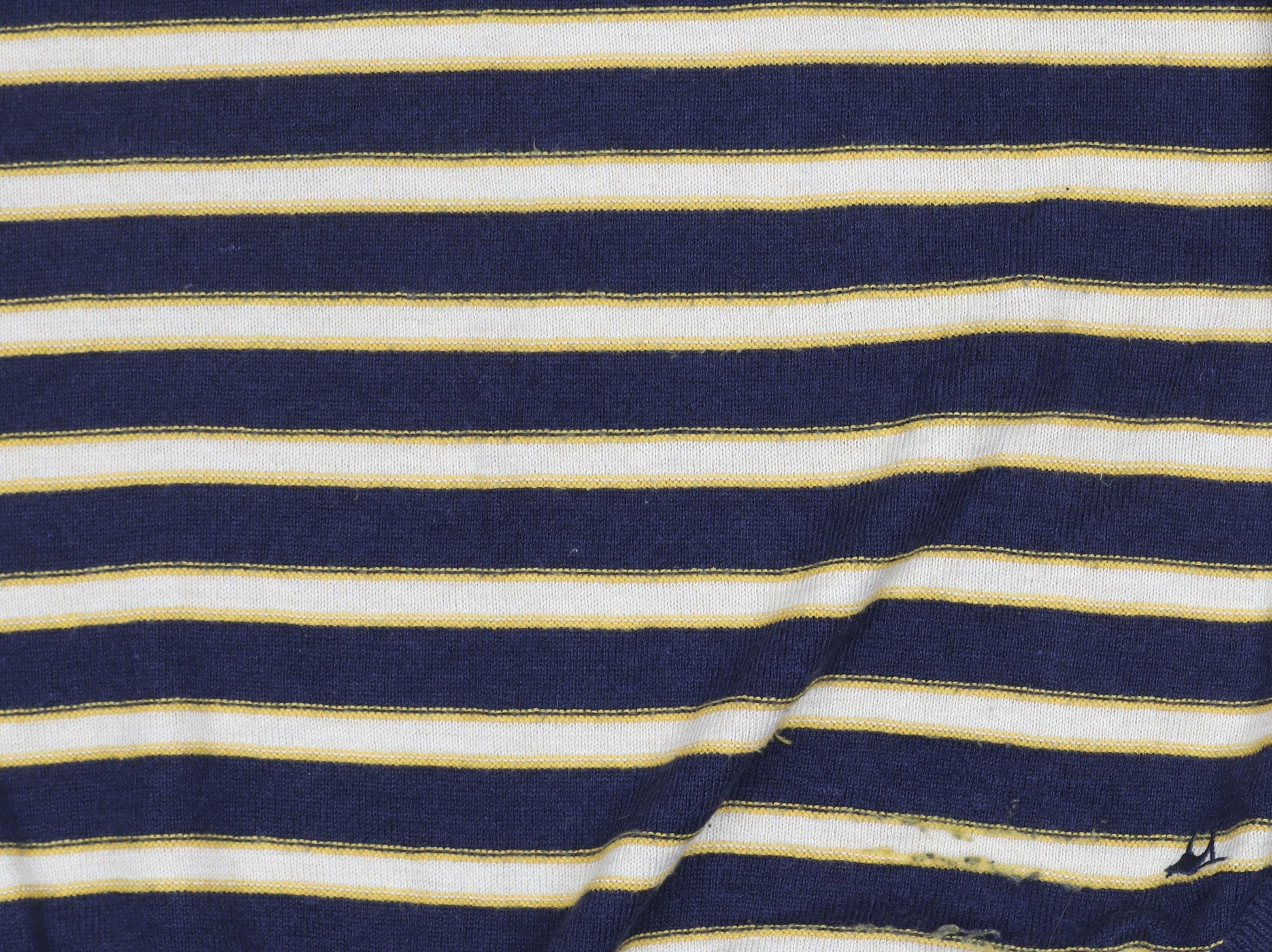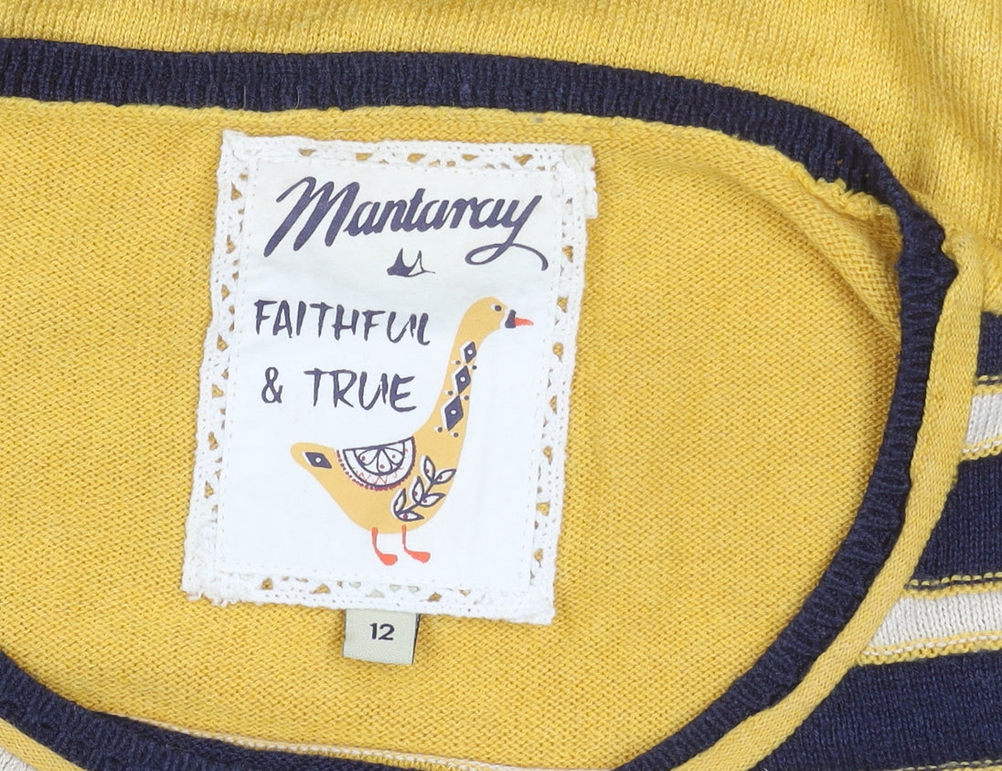 This Mantaray women's pullover jumper is a casual wardrobe staple with a stylish twist. Made from a soft blend of 40% viscose, 40% polyester, and 20% cotton, it combines comfort with durability, making it perfect for everyday wear. The knit fabric creates a lightweight feel, ideal for layering in cooler seasons such as autumn, spring, and winter. The design features a classic crew neckline and long sleeves finished with charming button roll tab accents, adding a touch of character to its otherwise simple style. Its multicoloured striped pattern in navy, yellow, and ivory tones gives it a bold yet versatile look, making it easy to pair with jeans, skirts, or casual trousers. The tight-knit construction keeps the fit structured and flattering without losing softness against the skin. This size UK 12 jumper offers a regular fit, ideal for women seeking both comfort and style. The pullover style ensures hassle-free wear, while the dependable construction makes it a go-to piece in your casual wardrobe. Its all-seasons practicality allows it to be worn on mild days as well as layered under coats or jackets in colder weather. Although this jumper remains in good condition, there are small signs of wear including tiny holes near the hem, which have been reflected in the price. These minor imperfections are not noticeable when layered or styled with high-waist bottoms. An excellent choice for casual outings, week-to-week wear, or even for relaxed office environments, this striped jumper can easily become your reliable everyday option. The vivid colours add personality while maintaining a classic appeal. If you are looking for a high-quality, versatile piece that will keep you both stylish and comfortable, this Mantaray pullover jumper is a perfect addition to your collection at a great price.