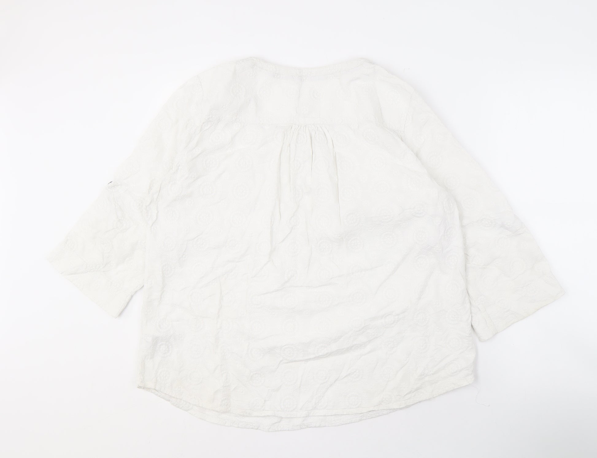 Brighten up your wardrobe with this elegant white blouse from Mantaray, crafted in pure cotton for a soft and breathable feel. Its classic 3/4 sleeve design and round neckline make it perfect for both casual and semi-formal occasions. The solid white colour offers a versatile look, ideal for pairing with various bottoms and accessories. A functional button closure adds a touch of simplicity and ease to its design. Whether dressing up for work or enjoying a stroll through the town, this blouse offers undeniable comfort and style. Condition is excellent, with minor wrinkles, ready to deliver a sophisticated look to your everyday wardrobe.