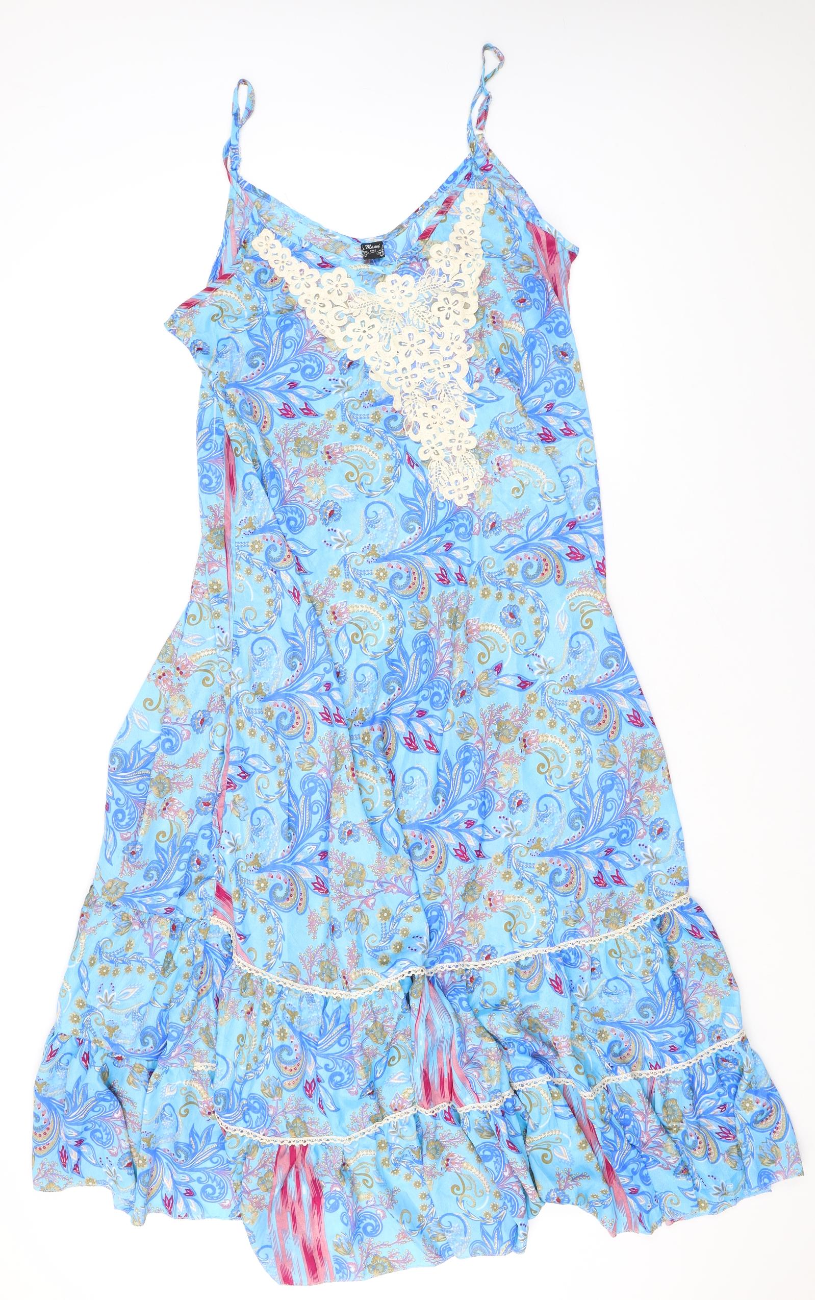 Womens Blue Geometric Silk A-Line One Size Round Neck Pullover - Lace Details