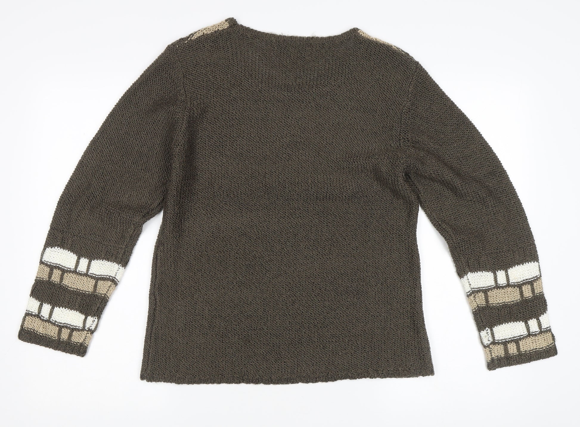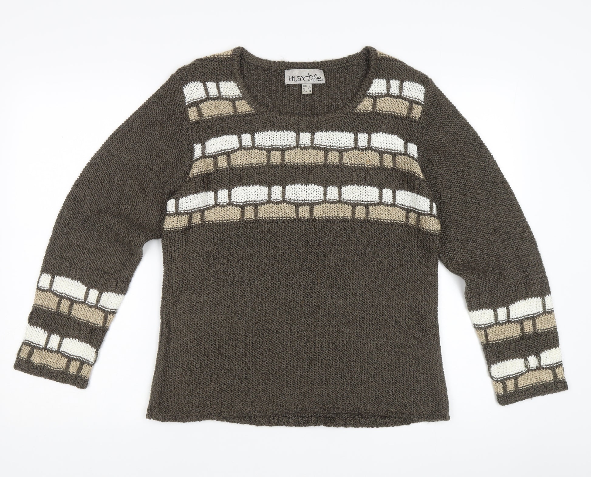 Step into understated elegance with this classic Marble Women's Jumper in a rich brown hue. Perfect for those chilly autumn and winter days, this long-sleeve jumper offers a cosy regular fit. The soft knit fabric, crafted from a blend of wool and acrylic, ensures both warmth and comfort without compromising on style. Its round neck design complements the beautifully patterned striped accents across the chest and sleeves, adding a touch of flair to any casual outfit. Ideal for weekend outings or relaxed evenings indoors, this jumper seamlessly fits into both casual and slightly dressier occasions. In excellent condition with minimal signs of wear, it's a reliable addition to your wardrobe. Pair it with jeans or a skirt for versatile styling. Don't miss out on this timeless piece that bridges comfort and style effortlessly.