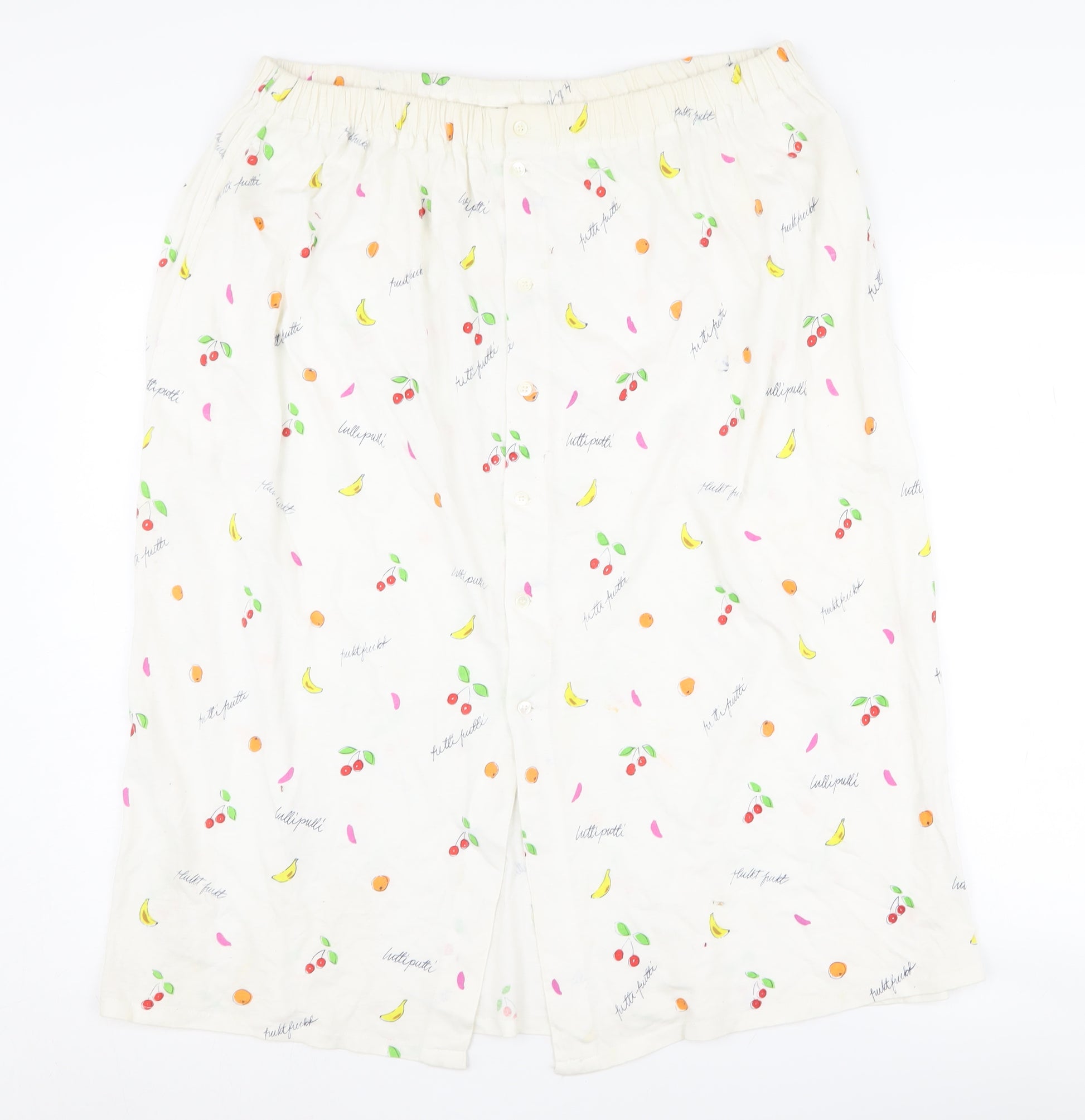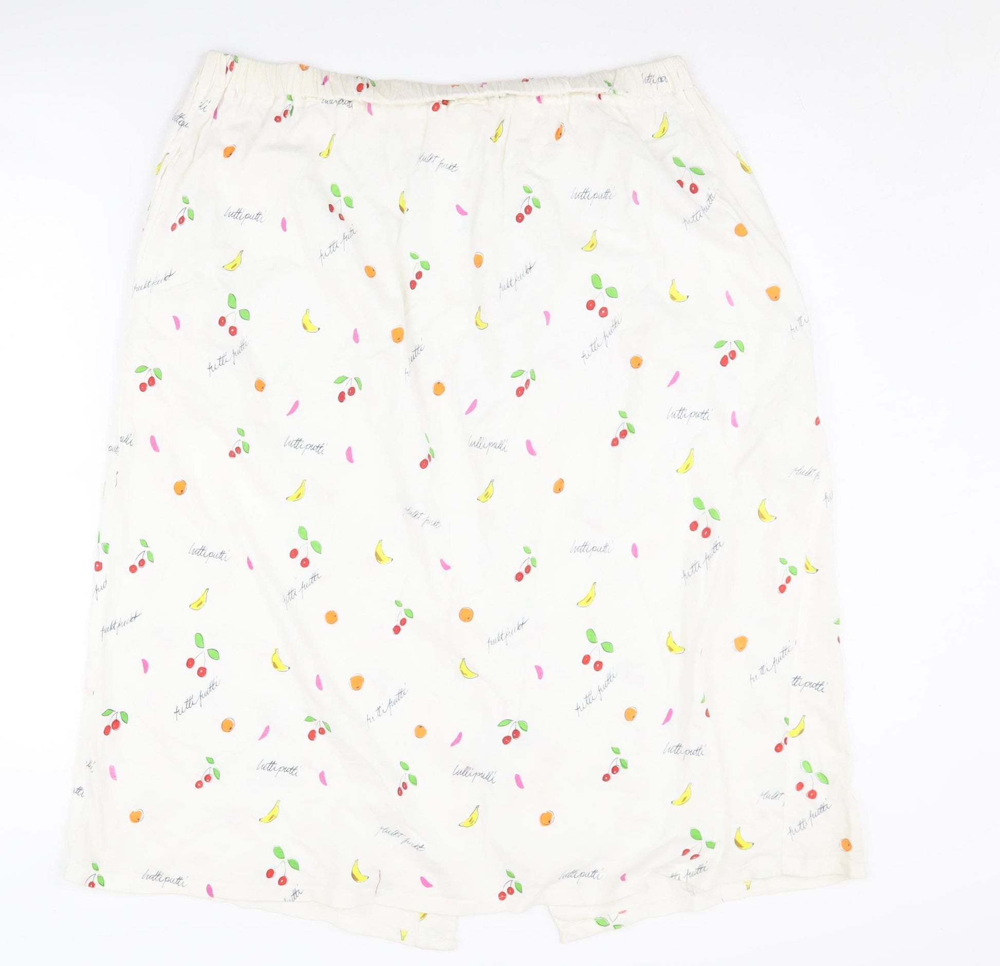 Step into summer with this delightful Marc O'Polo Women's Ivory Skirt, featuring a charming fruit print that's perfect for casual day outings and weekend gatherings. Made from 100% pure cotton, this skirt ensures breathability and comfort, making it an excellent choice for warm, sunny days. The playful pattern of assorted fruits adds a whimsical touch to your wardrobe, promising to turn heads and elevate your style effortlessly.Designed for ease, the skirt boasts an elastic waistband for a customised fit and freedom of movement. The button accents provide an extra flair to its look, seamlessly blending functionality with fashion. Though the skirt is in very good condition, a tiny stain is present, barely noticeable, making it a lovable piece for everyday use.This piece fits perfectly within the regular size type and is ideal for women seeking a blend of comfort and style. Whether you are off for a picnic in the park or a leisurely stroll by the sea, this skirt ensures you look and feel fantastic. The absence of visible brand tags denotes prior usage, so you can cherish this garment as a unique find.Add this versatile piece to your wardrobe today and enjoy the playful style that celebrates the essence of summer fruits!
