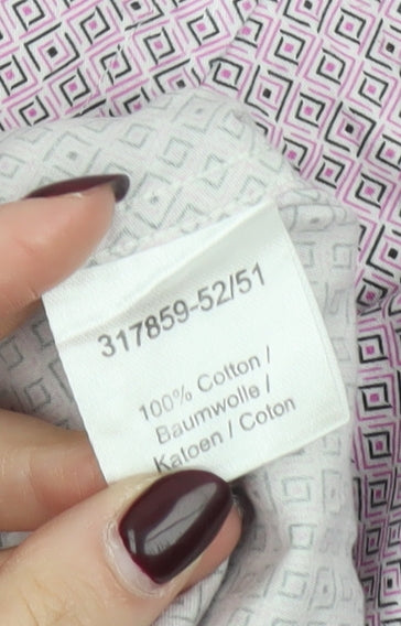 Step into timeless sophistication with this Marco Capelli men's formal shirt in a refined pink geometric pattern. Crafted from 100% cotton, this shirt offers a breathable and lightweight feel, making it ideal for business, formal occasions, and weddings alike. The collared neckline and button front closure create a classic silhouette that pairs effortlessly with tailored trousers or smart chinos.Designed in a regular fit, this long-sleeve dress shirt ensures comfort throughout your day while maintaining structure and shape. The durable woven cotton fabric delivers easy wearability with a soft finish against the skin, and the barrel cuffs provide a polished touch suitable for the office or any formal event. The subtle geometric pattern introduces understated style while keeping the look professional and versatile.This Marco Capelli shirt is finished with quality detailing and craftsmanship typical of the brand’s Firenze collection. Its sophisticated design blends contemporary Italian flair with traditional tailoring, making it an essential piece for the modern wardrobe. Whether you dress it up under a sharp blazer or wear it open-neck for a semi-formal meeting, it adapts seamlessly to a range of occasions.In excellent pre-owned condition, this shirt shows minimal signs of wear with only slight creasing from storage. Its breathable, machine washable cotton fabric makes it practical and easy to care for, ensuring it remains a go-to in your smartwear rotation. Perfect for everyday office wear, business events or elegant evening functions, this piece exudes enduring class and attention to detail.Revamp your formal collection with this premium-quality Marco Capelli shirt — effortlessly stylish, comfortable, and versatile enough to see you through every season in polished confidence.