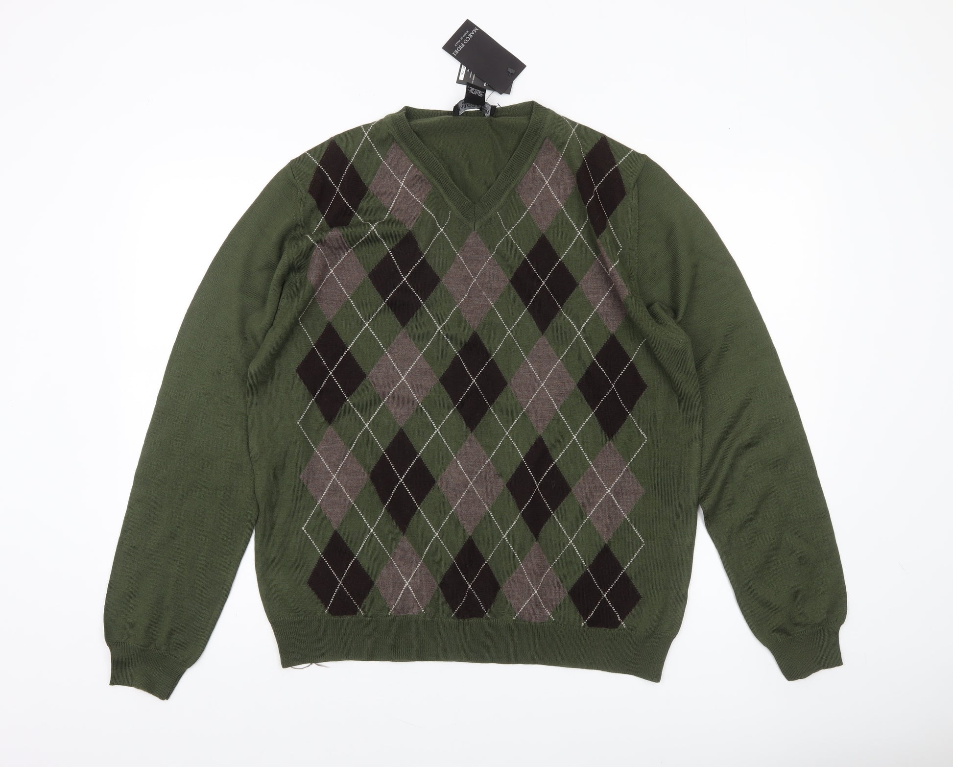 Men's Green Argyle Merino Wool V-Neck Jumper Size L