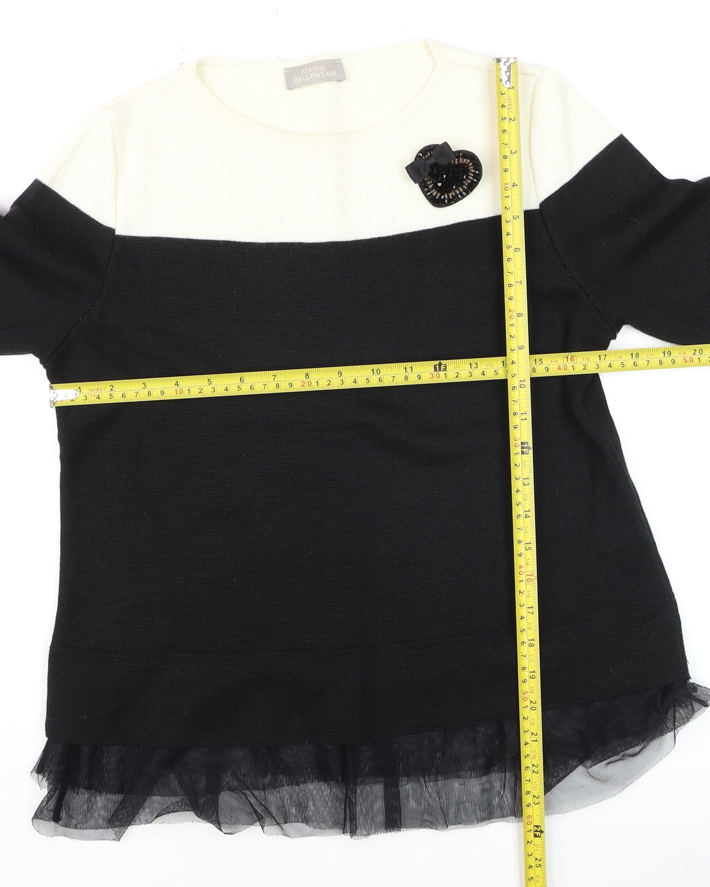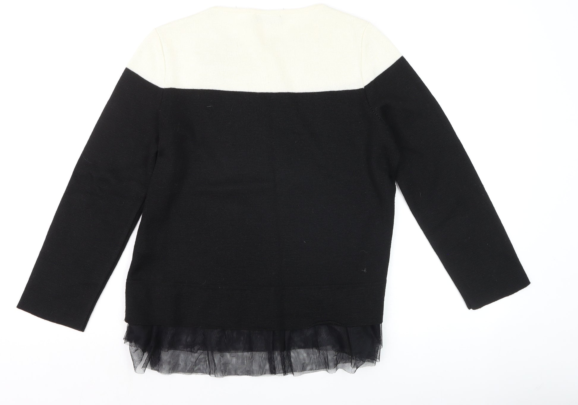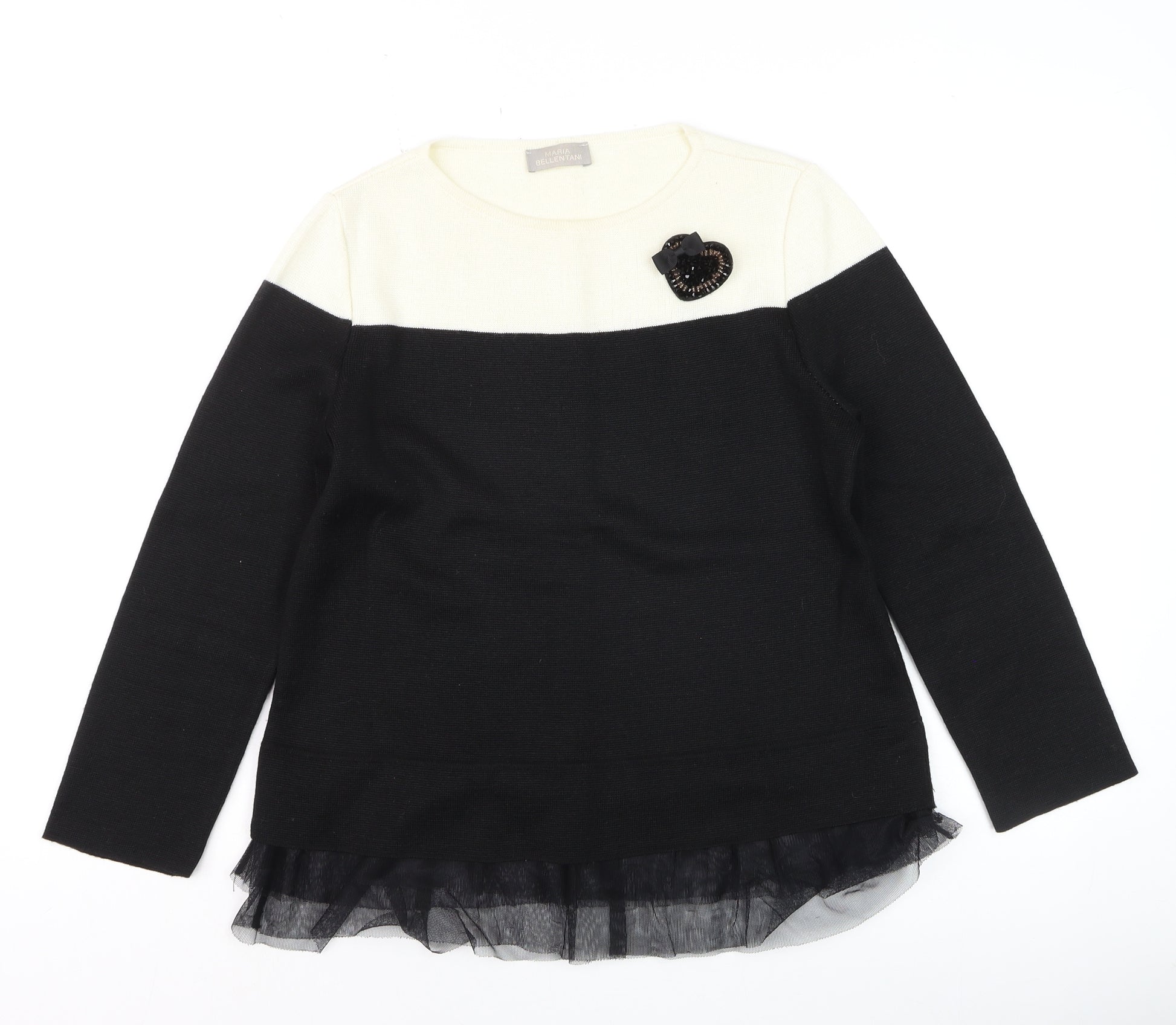Refresh your knitwear collection with this elegant two-tone jumper from Maria Bellentani. Crafted in Italy from a soft wool and acrylic blend, this women’s black and cream pullover offers a comfortable feel while adding sophisticated contrast to your wardrobe. Featuring a classic crew neckline and long sleeves, it provides warmth and style ideally suited for the cooler months. The hemline is adorned with a delicate black mesh ruffle trim that lends a unique, feminine finish. A subtle sequin embellishment near the neckline adds a stylish accent without overwhelming the look. Designed in a regular fit, this jumper flatters the silhouette while allowing ease of movement. Lightweight and breathable, it’s perfect for layering over a shirt or wearing on its own. The fine tight-knit texture helps retain shape and adds a refined appeal ideal for both casual and semi-formal settings. Pair it effortlessly with tailored trousers for a chic office look or wear with jeans for an elevated everyday ensemble. The premium wool and acrylic blend ensures both softness and durability, giving you lasting comfort. Finished in a versatile black shade with cream contrast yoke, it coordinates easily with neutral or bold accessories. Suitable for Autumn and Winter wear, this jumper embodies understated European elegance. Condition is excellent with minimal signs of light wear and no visible flaws. A high-quality piece from a renowned Italian designer, this jumper offers timeless sophistication that bridges comfort and modern style. Ideal for women who appreciate detail, quality and a refined aesthetic, this is an essential addition to any seasonal wardrobe.
