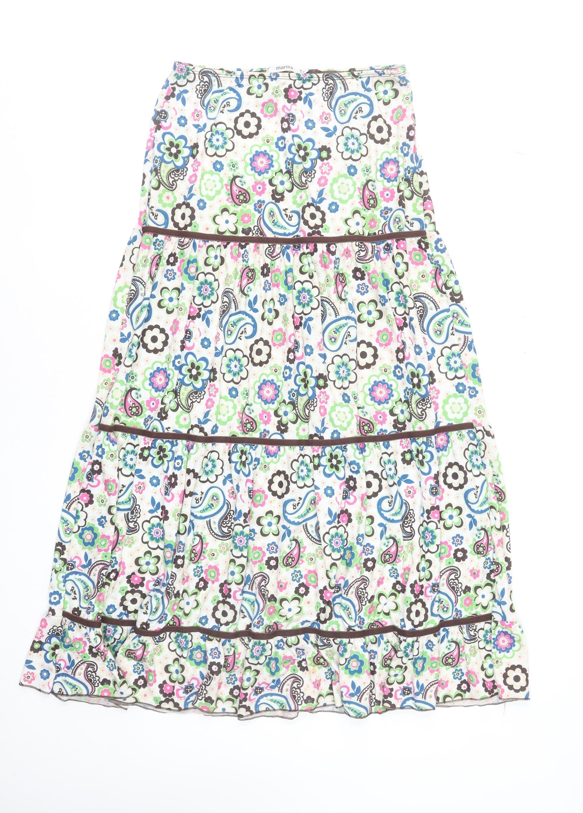 Add a touch of vibrant charm to your wardrobe with this beautiful Marisa Women's Peasant Midi Skirt. Designed in a lively multicoloured paisley and floral pattern, this skirt bursts with colour and style, perfect for spring and summer days. Made from a soft and stretchy jersey fabric composed of 95% polyester and 5% elastane, it offers comfort and freedom of movement while maintaining a feminine, flattering drape. The layered design gives it a subtle bohemian flair, ideal for relaxed weekends or holiday getaways. This midi-length skirt sits at a mid-rise position and features an elasticated waistband, providing an easy pull-on fit that flatters a variety of shapes. The rich mix of greens, blues, pinks, and browns on a light base makes it easy to pair with simple tops or blouses, giving a cheerful lift to your casual wardrobe. Whether dressed up with sandals or dressed down with trainers, this skirt transitions effortlessly through outings, picnics, and relaxed workplace settings.A great piece for women who love a stand-out yet versatile staple, its lightweight material ensures all-day comfort in warmer weather. The Marisa skirt channels a timeless bohemian spirit, perfect for those who appreciate bright prints and easy styling. In excellent pre-loved condition with no visible flaws, this skirt promises lasting wear and eye-catching appeal at a great value. Refresh your casual collection with this effortlessly pretty and comfortable addition.
