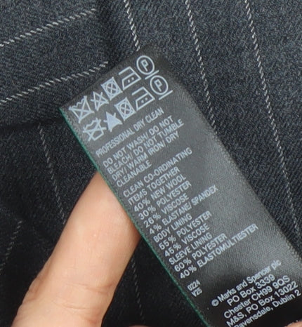 Add timeless elegance to your wardrobe with this Marks and Spencer Autograph women’s pinstripe blazer in a sophisticated grey hue. Designed in a classic single-breasted style with a one-button closure, this tailored blazer offers a polished finish that complements both business and formal styling. The structured notch lapels and cropped length give it a contemporary look, ideal for pairing with matching trousers or a pencil skirt for a refined power suit ensemble. Crafted from a quality blend of wool, polyester, viscose and elastane, this woven fabric blazer ensures both comfort and durability while retaining a stylishly smooth drape. The fully lined interior—composed of polyester, viscose and elastomultiester—enhances comfort, making it perfect for day-to-night wear. The subtle pinstripe pattern adds a touch of sophistication and visual texture that stays evergreen in office fashion.This jacket, sized UK 16, has a regular fit and long sleeves that give a flattering silhouette, suitable for autumn through winter and early spring. Designed with attention to refined detailing, it delivers a tailored yet comfortable feel. Whether styled with cigarette trousers for work, a fitted dress for meetings, or jeans for a smart-casual weekend, this piece exemplifies flexible elegance. Conditioned in excellent pre-loved shape with no visible marks or signs of damage, this quality Marks and Spencer blazer has been well cared for. Perfectly versatile and stylishly understated, it stands as a wardrobe essential for any woman seeking effortless professional polish without compromising comfort. Its timeless appeal makes it a dependable go-to for modern business attire or polished formal occasions.