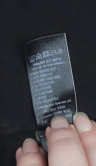 Introduce refined sophistication into your wardrobe with this elegant Marks and Spencer Autograph women's black blouse. Crafted from a premium blend of polyester, viscose, and elastane, this piece combines comfort and durability with an effortlessly stylish finish. The short sleeves feature intricate lace detailing, adding a touch of femininity and texture to the simple solid black design. Its flattering round neckline and clean silhouette make it a versatile choice that transitions seamlessly from work to evening occasions. The back zip fastening ensures a smooth fit while maintaining a refined, tailored shape that flatters the figure. Ideal for pairing with tailored trousers or a sleek pencil skirt, this blouse is perfect for business meetings, dinner dates, or casual outings where a polished look is desired. The fabric’s structure provides a comfortable stretch, allowing ease of movement while retaining its smart shape throughout the day. Designed for all-season wear, this blouse delivers timeless appeal, offering year-round style and practicality. Whether layered under a blazer for a corporate look or paired with jeans for smart-casual chic, it’s a piece you’ll return to time and again. The Autograph collection from Marks and Spencer represents quality craftsmanship and modern tailoring—the essence of understated British elegance. Machine washable for easy care, this top offers both convenience and sophistication. In excellent pre-owned condition with only minimal signs of wear, this black lace sleeve blouse remains in beautiful shape, ready to elevate any wardrobe with its subtle charm and contemporary edge. An understated yet luxurious staple, perfect for any occasion where style and class are key.