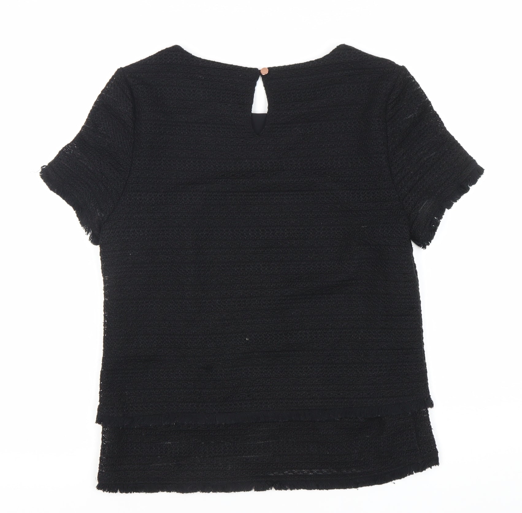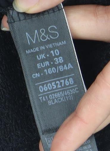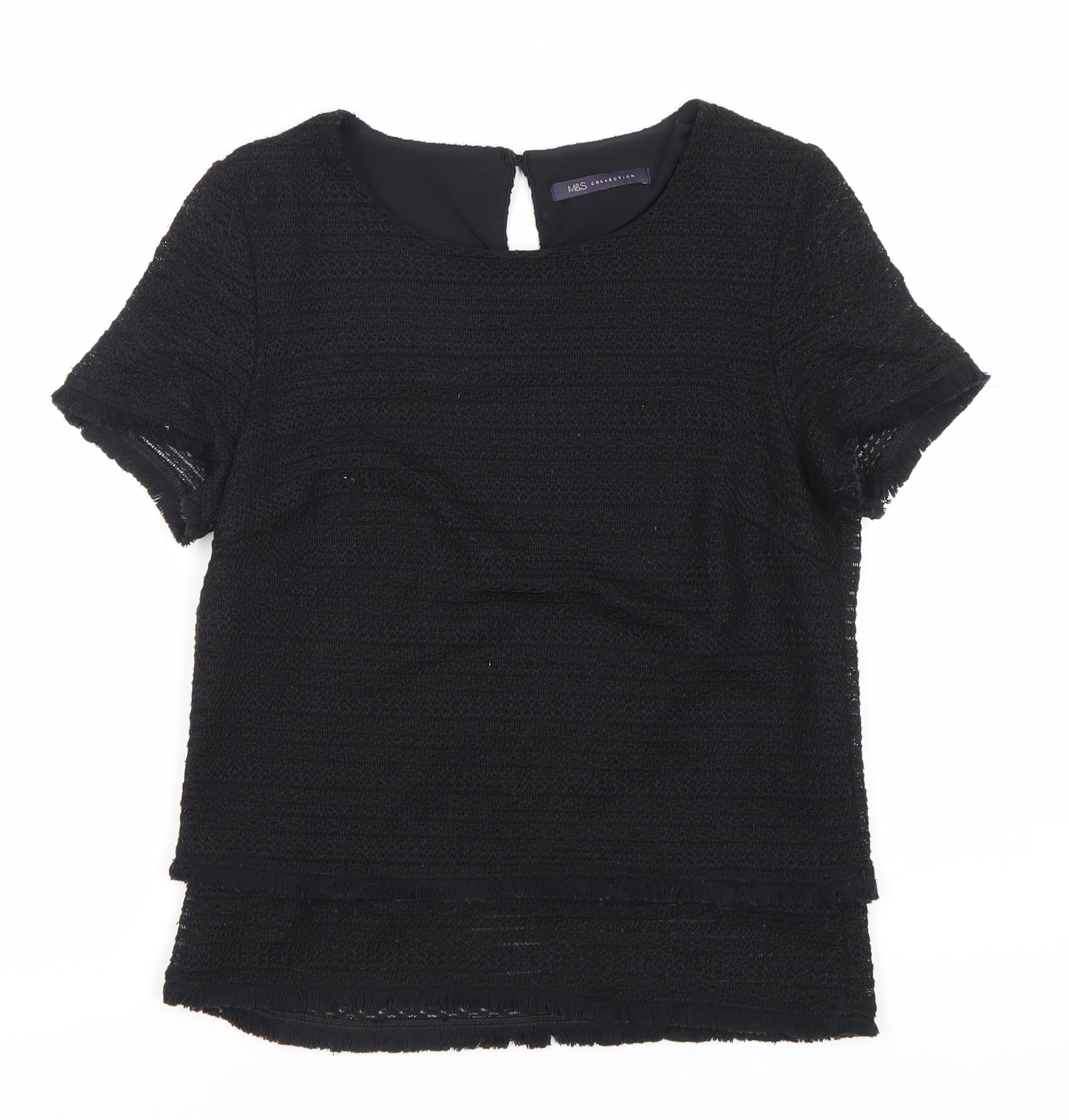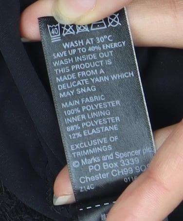 Discover classic elegance with this Marks and Spencer women's short sleeve top. Tailored in a versatile size 10, this piece offers a perfect fit for everyday sophistication. Crafted in a timeless black hue, this top seamlessly blends into any wardrobe. Whether dressing up for a night out or pairing elegantly with office attire, it promises versatility. The material comprises 88% polyester and 12% elastane, providing a comfortable stretch that compliments any silhouette. The solid pattern ensures an effortless match with various bottoms, while its casual short sleeves enhance a laid-back yet polished look. Fully lined for your comfort, this top reflects the brand's commitment to quality. Easy to care for with machine washability, it remains in very good condition with minimal signs of wear. Elevate your ensemble with this stylish top, an essential for fashion-forward individuals. Available now at a competitive price, it's a must-have addition to your collection.