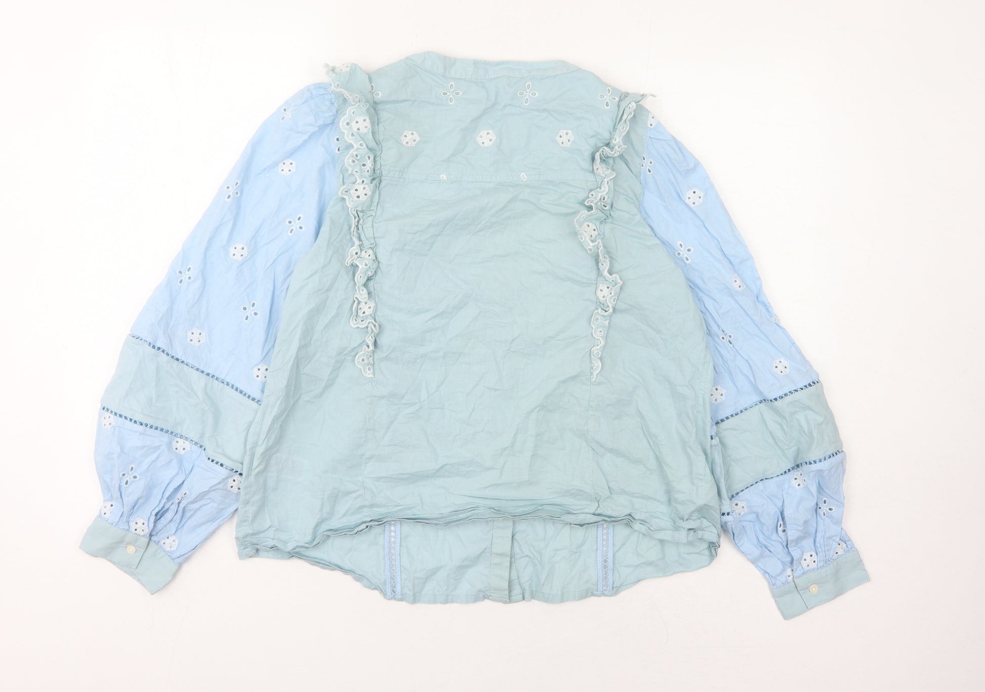 Transform your wardrobe with this exquisite Marks and Spencer women's blouse, perfect for spring and summer wear. Crafted from a durable blend of 74% cotton and 26% polyester, this piece promises comfort and style in equal measure. The soothing blue hue complemented by delicate floral embroidery and charming ruffles exude elegance and femininity, making it a versatile addition to any wardrobe. Tailored with balloon long sleeves and lined with intricate embroidery, this blouse is designed to turn heads. The regular fit and user-friendly button closure ensure a comfortable and flattering silhouette. Whether attending a casual gathering or opting for a relaxed office look, this blouse is a must-have for those who appreciate quality craftsmanship and timeless charm. Elevate your casual ensemble and enjoy the convenience of machine-washable care, making this piece as practical as it is stylish. With its rich detailing and refined fabric, this blouse stands as a testament to Marks and Spencer's dedication to quality fashion.