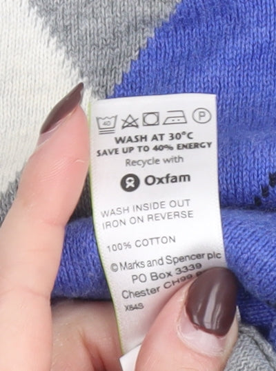 This Marks and Spencer Blue Harbour men’s V-neck jumper offers timeless style with a refined classic Argyle diamond pattern in shades of grey, blue, and white. Crafted from 100% cotton, it provides a comfortable and breathable feel, perfect for layering through autumn, winter, or early spring. The soft knit fabric ensures warmth without bulk, making it ideal for casual days or smart-casual occasions. Designed for a regular fit, this pullover jumper flatters while maintaining ease of movement. The grey base allows for effortless pairing with chinos, jeans, or formal trousers, making it a wardrobe staple for men who value both comfort and understated sophistication. The ribbed cuffs, neckline, and hem retain shape over time, showcasing durable Marks and Spencer quality. Versatile enough for weekend wear, work settings, or relaxing evenings out, this jumper combines practicality with a timeless masculine aesthetic. As part of the popular Blue Harbour collection, it carries a nautical-inspired influence that appeals to men who appreciate durable, dependable clothing. The condition of this jumper is very good, showing slight natural signs of use but remaining in great wearable shape with soft, intact fibres and no major flaws. Easy to care for, it’s machine washable, lightweight, and breathable, ensuring longevity and comfort season after season. Perfect for adding a touch of pattern to any outfit, this jumper brings classic British menswear charm to a modern wardrobe—suitable for casual business meetings, everyday wear, or smart weekend dressing. A stylish, dependable cotton knit that looks as good with a collared shirt as it does layered over a T-shirt, offering smart simplicity and enduring appeal for the modern gentleman seeking relaxed refinement.