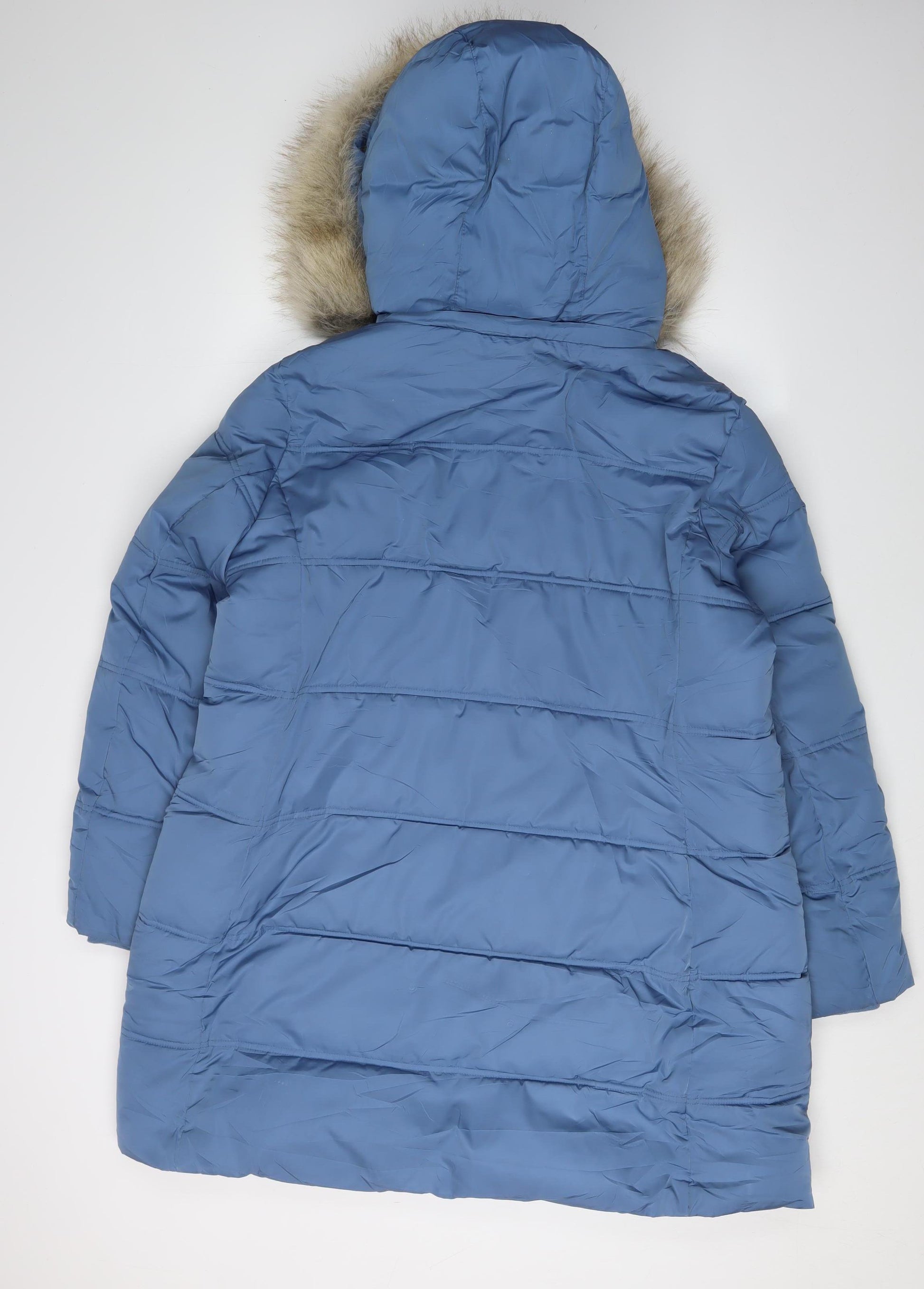 Embrace the winter months with this stylish and practical Marks and Spencer Blue Puffer Coat. Designed specifically for women, this mid-length coat combines functionality and fashion effortlessly. The vibrant blue hue is sure to make a statement, while the fur-trimmed hood adds a touch of elegance and warmth during chilly days.Crafted from high-quality polyester, both the outer shell and lining ensure durability and comfort. The puffer design and polyester insulation make this coat an ideal choice for winter, providing you with exceptional warmth and protection against the cold. Featuring a secure zip closure and practical pockets, it's perfect for carrying essentials while keeping your hands warm.Whether you're heading to a casual meet-up or just running errands, this versatile coat suits any casual occasion. The softshell fabric type further enhances comfort, making it a perfect addition to your winter wardrobe. Despite its excellent condition, the coat shows minor marks on the fabric, contributing to the used yet well-maintained look.Don’t miss out on this essential piece that combines versatility with style, promising warmth on the coldest of days. Attractively priced, this is a must-have for your collection.