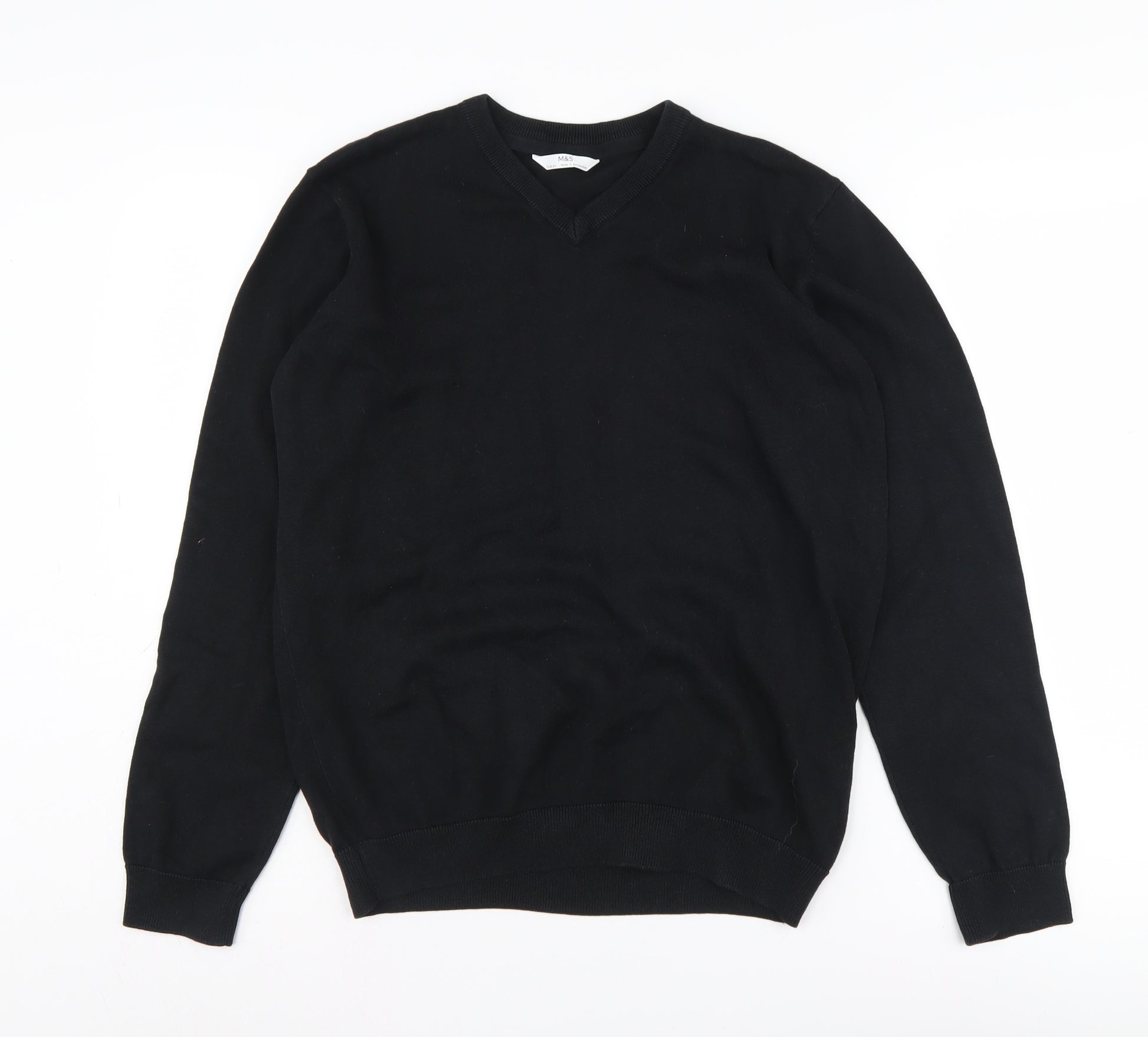 Elevate your child's wardrobe with this classic Marks and Spencer Boys Black V-Neck Pullover Jumper, perfect for cooler autumn and winter months. Crafted from 100% cotton, the jumper offers a luxurious feel against the skin while ensuring breathability and comfort throughout the day. Its tight-knit fabric and regular fit provide a snug yet relaxed silhouette, making it an ideal choice for casual occasions. With a timeless black hue, this jumper effortlessly complements any outfit, offering versatility and style in one. Designed for boys aged 15-16 years, this V-neck jumper is perfect for layering over shirts or under jackets, giving a polished and stylish look. It's machine washable, allowing for easy care and maintenance, fitting seamlessly into your busy lifestyle. Whether it’s for school, weekend outings, or simply enjoying time with friends, this Marks and Spencer jumper is a steadfast addition to any young gentleman's clothing collection. Don't miss out on securing this high-quality piece at an exceptional value.