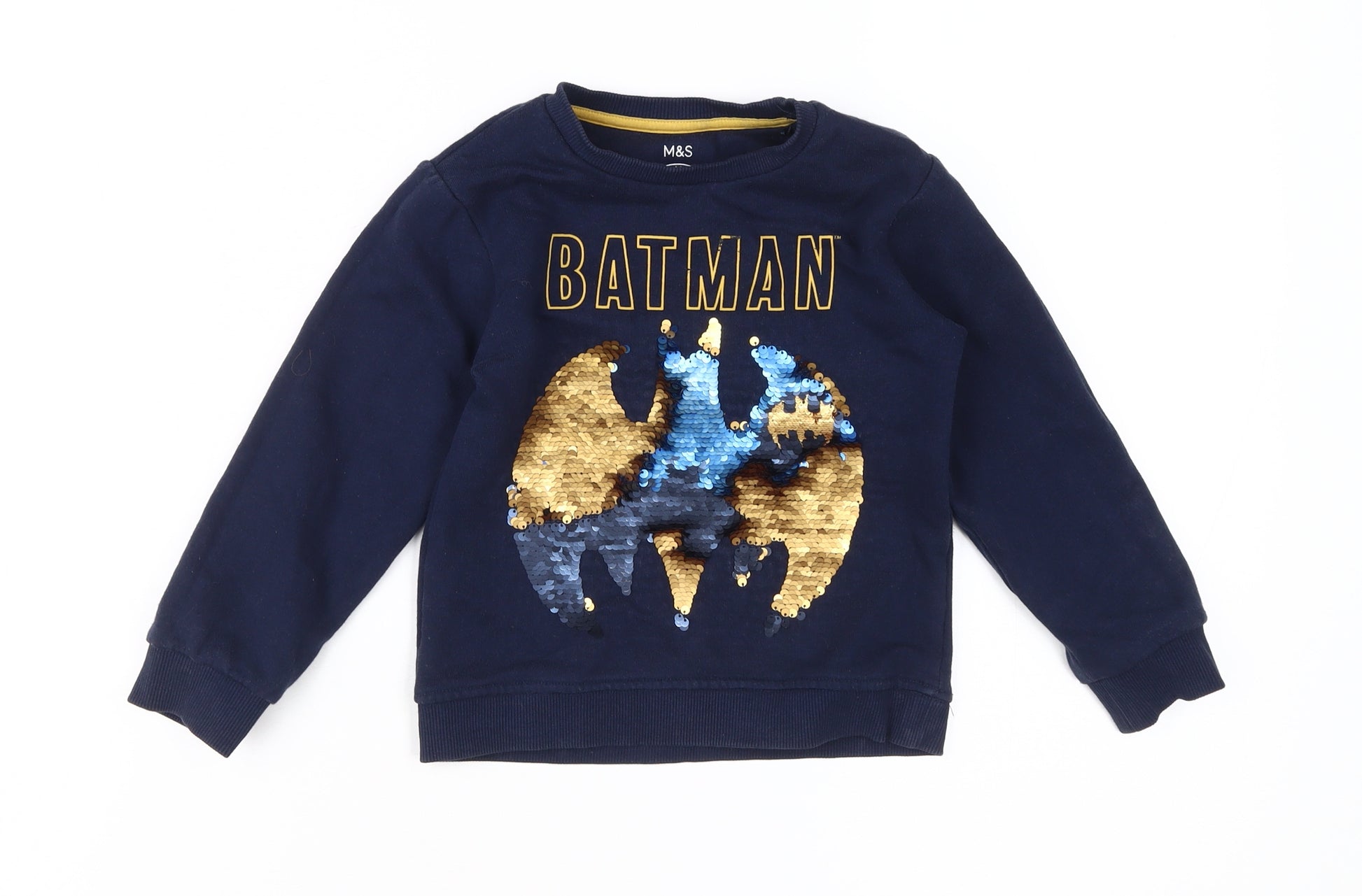 Embrace the iconic superhero vibe with this boys' Batman sweatshirt from Marks and Spencer. Expertly crafted for both comfort and style, this pullover sweatshirt features a striking blue background that perfectly contrasts with the eye-catching sequin and logo accents associated with the legendary Batman. Designed for boys in the 2-3 years age range, the regular-fitting design ensures a comfortable wear for all-day activities.Made primarily from high-quality cotton blended with elastane and polyester, this sweatshirt promises durability and a soft touch against the skin, while maintaining a breathable quality that's essential for active youngsters. The crew neckline and long sleeves offer additional warmth, making it an ideal choice for all seasons. Furthermore, a superhero theme combined with a graphic print pattern offers a playful touch to any young lad's wardrobe.Easily machine washable, it requires minimal upkeep and retains its vibrant look even after prolonged use. Whether for casual outings, playdates, or themed parties, this Batman sweatshirt is sure to be a favorite in your child's closet, thanks to its comfortable jersey fabric and visually appealing superhero design.