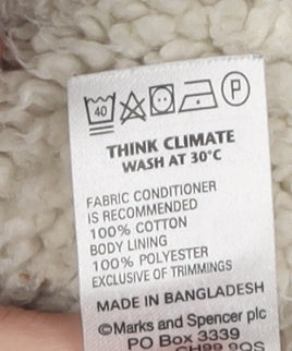 Keep your little one cosy and stylish with this charming full zip jumper from Marks and Spencer. Crafted from 100% cotton, this blue jumper ensures comfort and durability for active boys. The cable-knit design adds a classic touch, while the soft hood and full lining provide extra warmth for the chilly winter months. With its practical zip closure and long sleeves, this jumper is perfect for layering over everyday outfits. Ideal for casual occasions, this regular fit jumper is machine washable, making it easy to keep clean. Although pre-owned, it remains in very good condition, showing only minor signs of wear. This Marks and Spencer piece is perfect for young boys aged 5-6 years, making it a versatile and practical addition to any wardrobe.