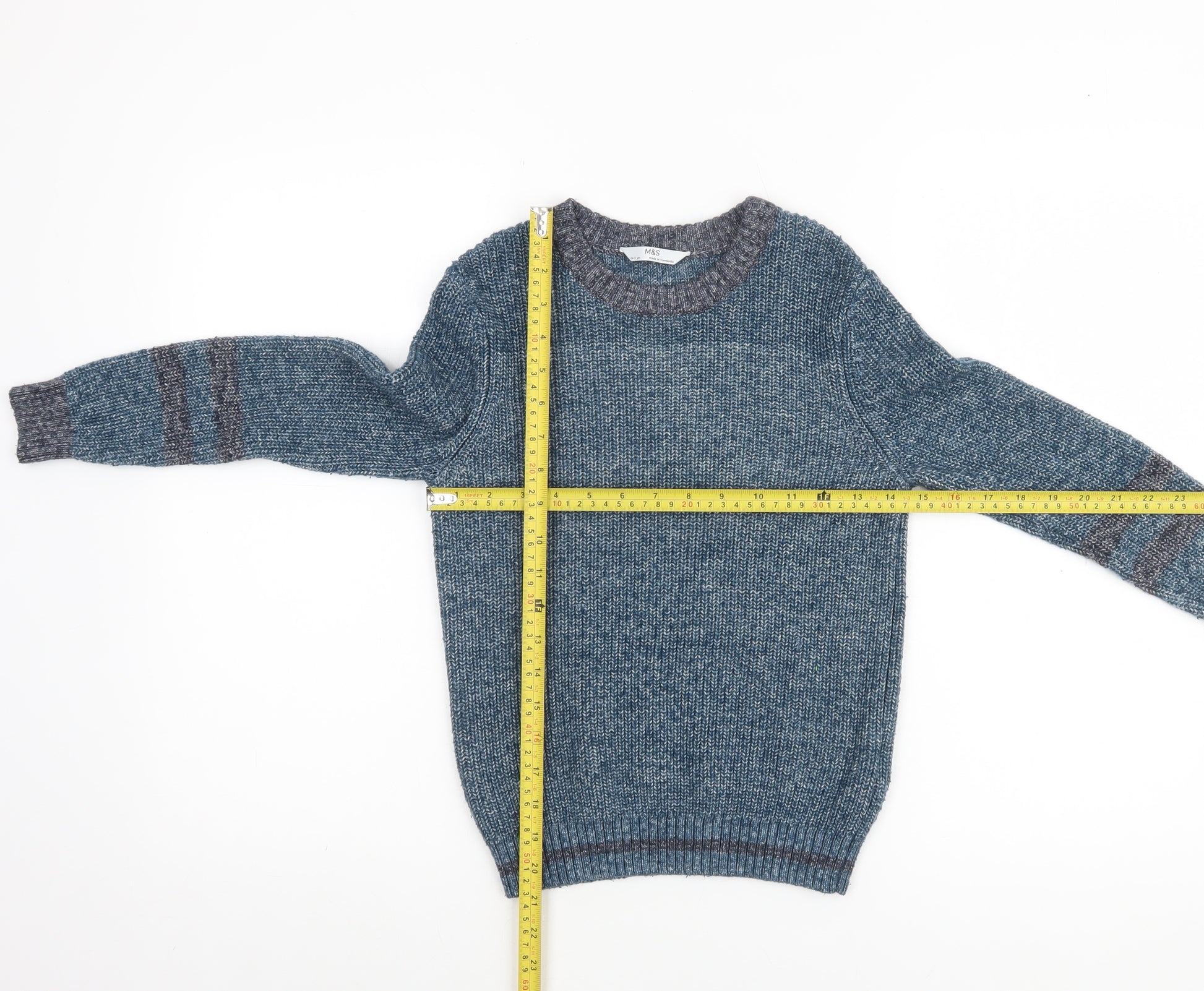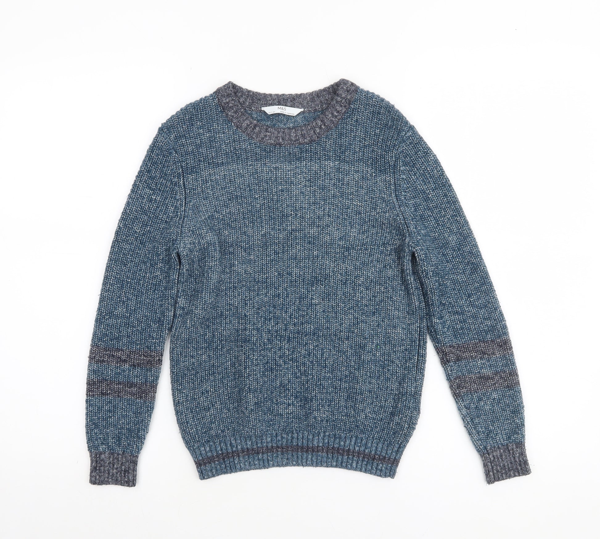 This Marks and Spencer boys' crew neck jumper offers timeless style and cosy comfort, making it a perfect choice for chilly days. Expertly crafted from a soft cotton and acrylic blend, it ensures durability and breathability while retaining warmth. The mottled blue knit design is accented with contrasting grey ribbing at the neckline, cuffs, and hem, providing a classic yet modern touch that pairs effortlessly with jeans or smart trousers alike. Designed in a regular fit, this pullover allows easy movement and comfort for everyday wear. The tight-knit structure helps maintain its shape over time, while the ribbed trim adds a snug finish around the edges. Suitable for autumn and winter, it provides reliable warmth without feeling too heavy. Ideal for school days, playtime, or casual family outings, this jumper embodies everyday practicality with understated style. Machine washable for easy care, it retains its softness and colour wash after wash. Sized for boys aged 10-11 years, it’s a versatile addition to any young wardrobe and a dependable layering option throughout the cooler months. This pre-owned piece remains in excellent condition, with no visible flaws, fading, or damage, ensuring both comfort and quality at a great value. Add this blue Marks and Spencer knit jumper to your child’s rotation for a touch of classic British design and long-lasting wear they’ll love season after season.