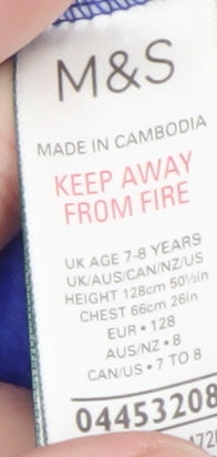 Keep your little one cosy and comfortable with this Marks and Spencer boys’ hooded fleece robe, designed in a vibrant blue with an eye-catching Godzilla-themed graphic print. Crafted from soft, plush polyester fleece, this robe delivers a warm and snuggly feel that’s perfect for lounging or bedtime during cooler months. Featuring a roomy hood, long sleeves with ribbed cuffs, and a large front kangaroo pocket, it combines both fun and practicality. Made to Marks and Spencer’s reliable standards, it’s machine washable for easy care, ensuring it remains looking bright and soft, wash after wash. The robe’s pullover style makes it easy for kids to put on themselves, perfect for chilly mornings or relaxed evenings. Recommended for boys aged 7–8 years (128cm height), it fits comfortably without restricting movement. The bold Godzilla theme adds a playful twist that’s sure to delight any young fan of monsters or cartoon characters, blending cosiness with imagination. This excellent condition piece shows no signs of damage or wear, although original store tags are not included. Ideal for winter lounging, sleepovers, or weekend mornings, it brings together warmth, durability, and child-friendly design. Whether given as a thoughtful gift or added to a little one’s nightwear wardrobe, this Marks and Spencer robe stands out for its high-quality fleece fabric and cheerful look. A must-have for boys who love something fun yet soft to snuggle into, this Godzilla print robe encourages comfort and joy with every wear.